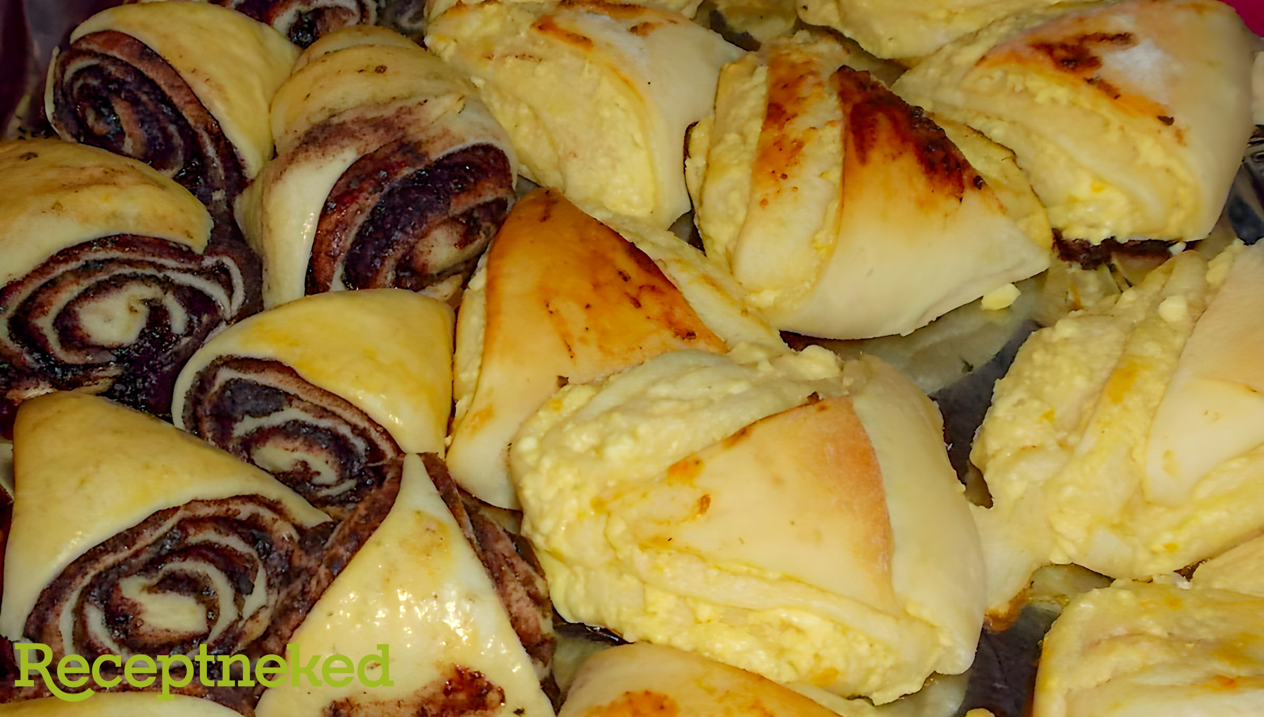 A maradék két adag tésztát túrós töltelékkel készítjük el, ugyanúgy feltekerve és háromszögekre vágva.