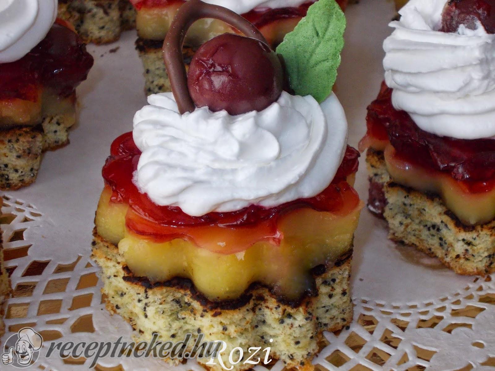 2 dl tejszínhabot kevés cukorral felverünk, habzsákba rakjuk, és minden tésztára egy rózsát nyomunk, arra egy meggy szemet és ízlés szerint díszítjük.