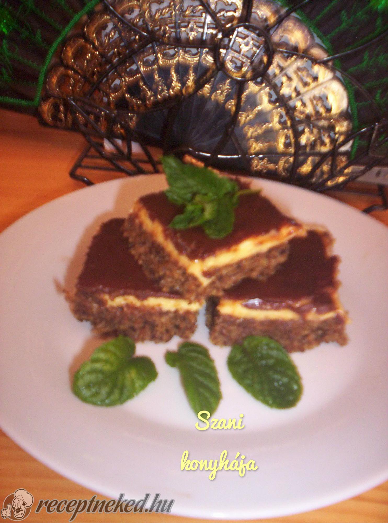 A tetejét csokimázzal vonjuk be: 1 tábla étcsokoládét gőz fölött megolvasztunk, elkeverjük 1–2 evőkanál olajjal, majd a sütemény tetejére simítjuk.