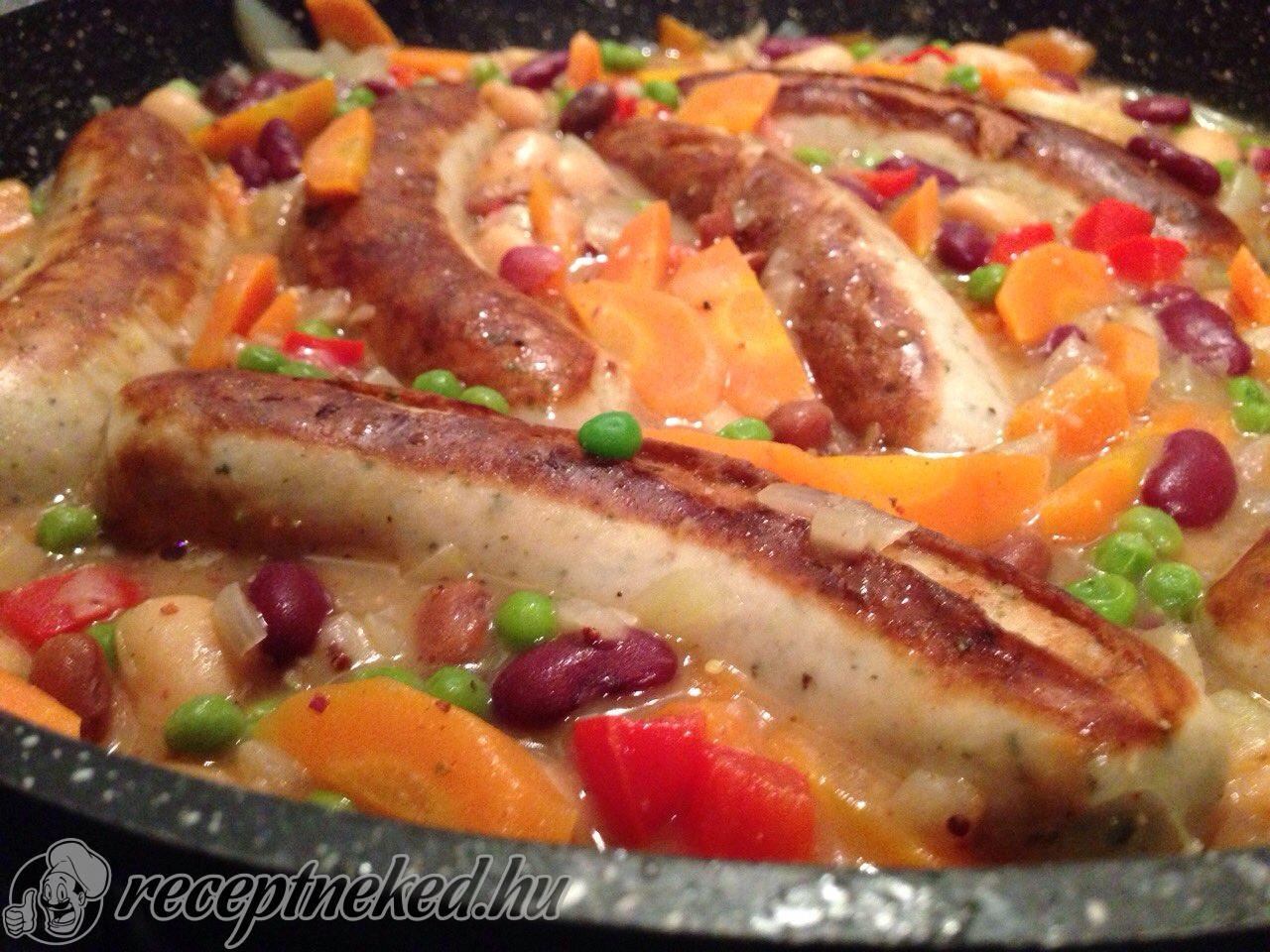 Ha a hagyma és a répa már kellően puha, hozzáadjuk a leszűrt babkonzerveket, a borsót, a kockára vágott kápia paprikát, és a vörösborecetet. Sózzuk, borsozzuk, alaposan összekeverjük, felöntjük az alaplével, visszahelyezzük a kolbászokat, és fedő alatt, újraforrást követően 10 percet pároljuk, hogy az ízek összeérjenek.