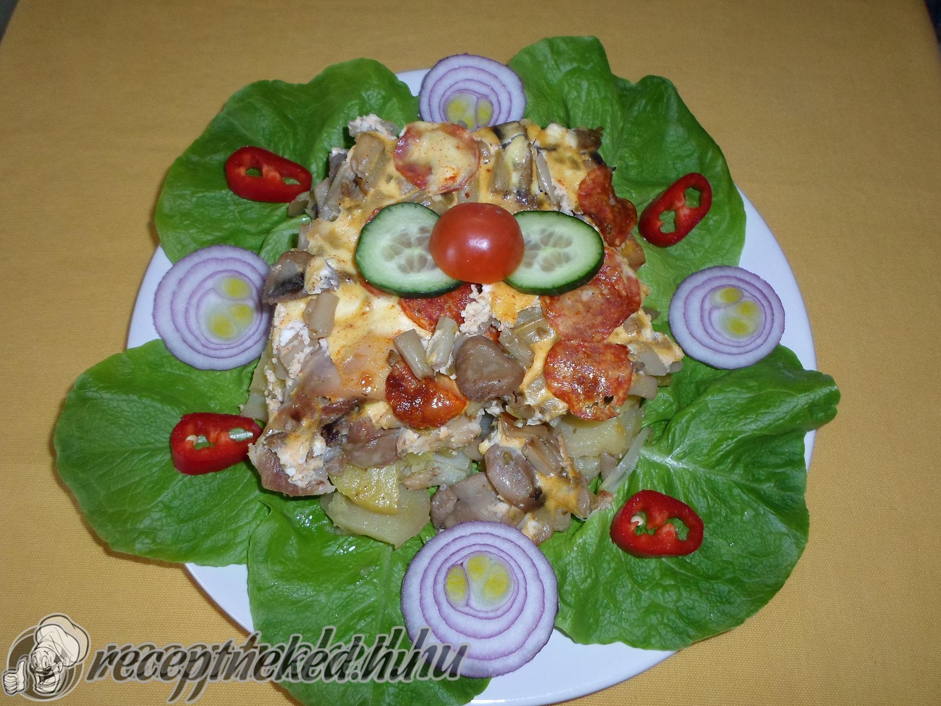 A gombát kevés olajon megdinszteljük a zöldbabbal együtt, ízlés szerint sózzuk, fűszerezzük. Egy tepsit olajjal kikenünk, a szalonna szeletekkel kirakjuk, beleszeleteljük a burgonyát, ráhelyezzük a megsült csirkecombokat, ráborítjuk a zöldbabos gombát, rászeleteljük a kolbászt és a vöröshagymát, és fóliával letakarva 30 percig sütjük.