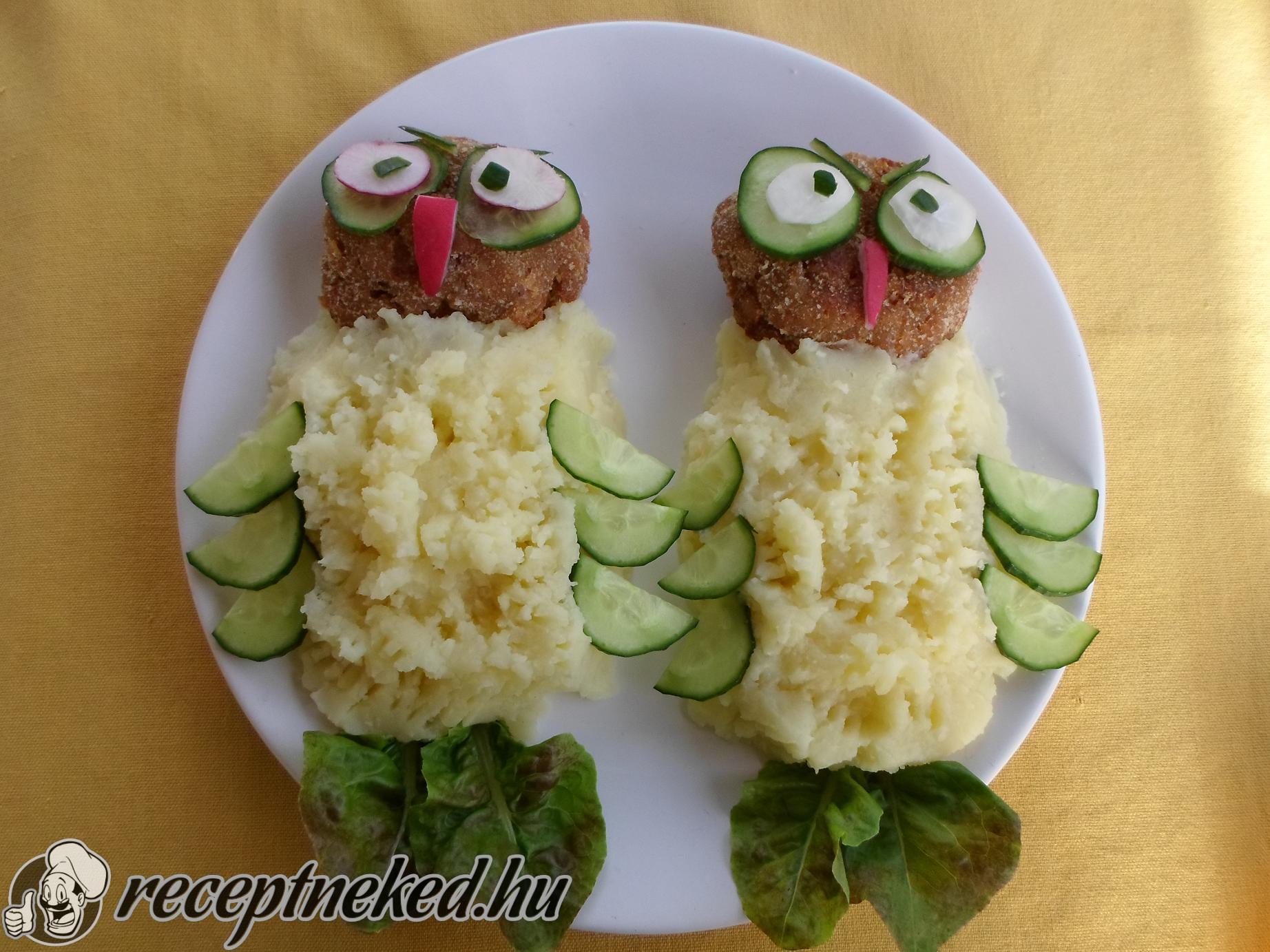 Egy tányérra halmozunk 3-4 ek krumplipürét eligazgatjuk. Fölé teszünk egy-egy fasírt pogácsát és elkezdjük díszíteni.