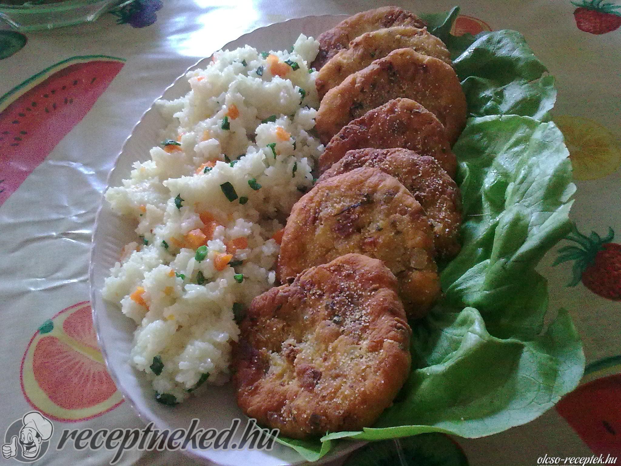 A tésztát kinyújtjuk és ráterítjük az előkészített hozzávalókat, amikkel újra átgyúrjuk. A tésztából egy vastag hurkát sodrunk, amit 2cm-es darabokra vágunk, és tenyérrel kissé ellapítunk. Liszt és prézli keverékébe megforgatva forró olajban aranysárgára sütjük. Frissen, forrón salátával tálaljuk.