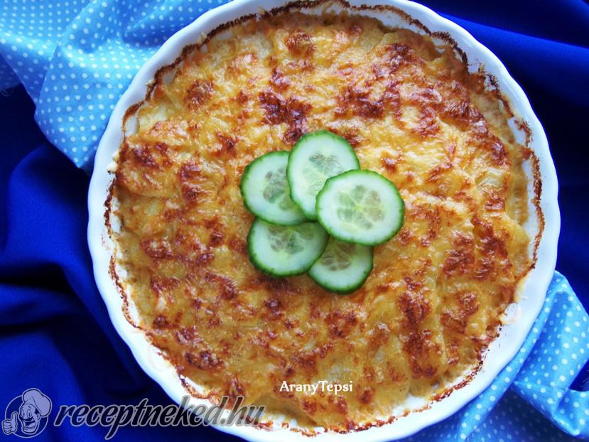 A zöldségeket alaposan megtisztítjuk, a nyers krumplit uborkagyalunk vékonyra szeljük. A vöröshagymát a burgonya vastagságára szeleteljük (nem szükséges a szeleteket rétegekre bontani), a sajtot lereszeljük.