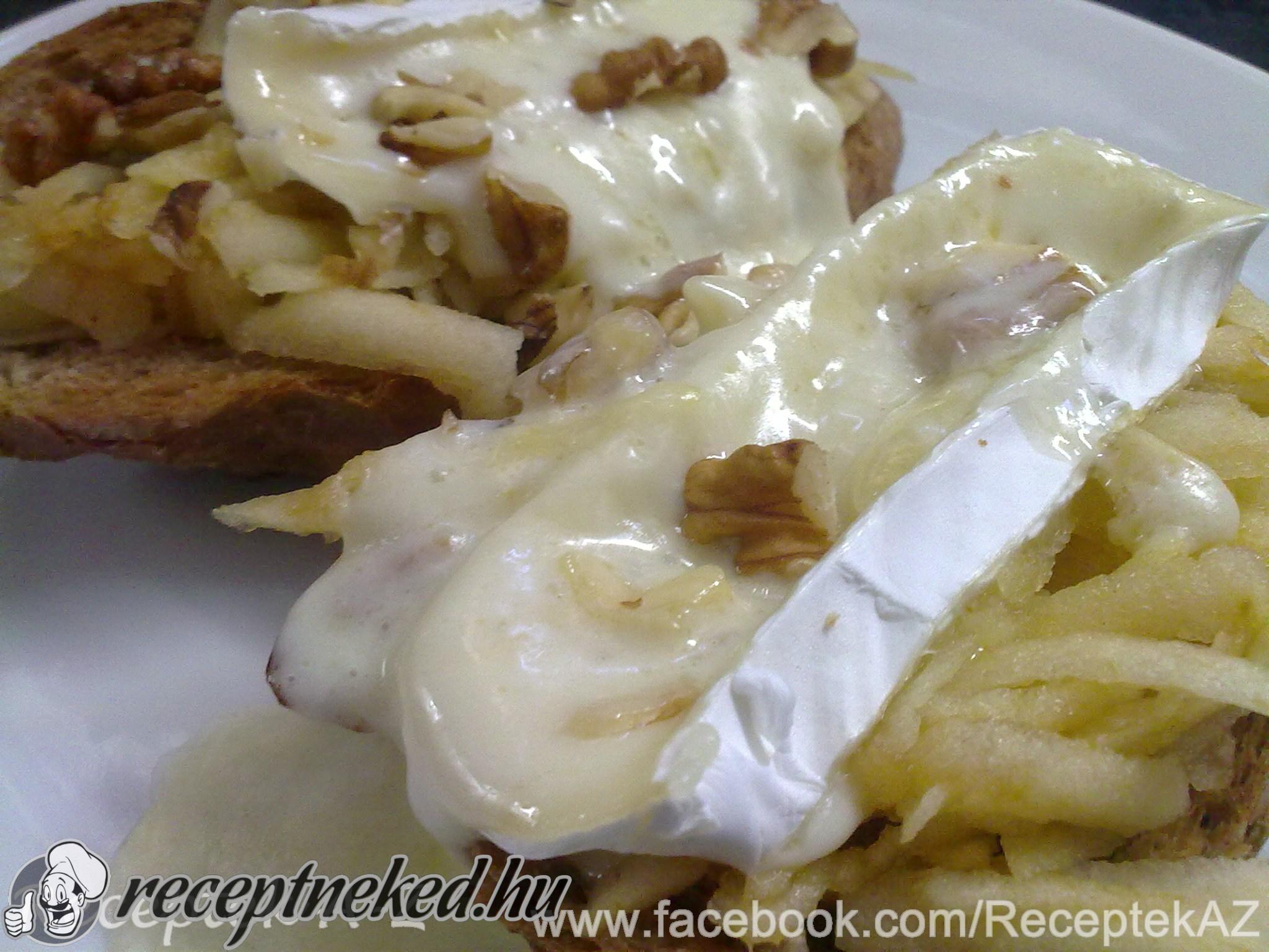 A kenyereket megpirítjuk. Reszelőn lereszeljük az almákat és elosztjuk a pirított kenyereken. A camembert szeleteket ráhelyezzük a reszelt almákra, megszórjuk durvára tört dióval.