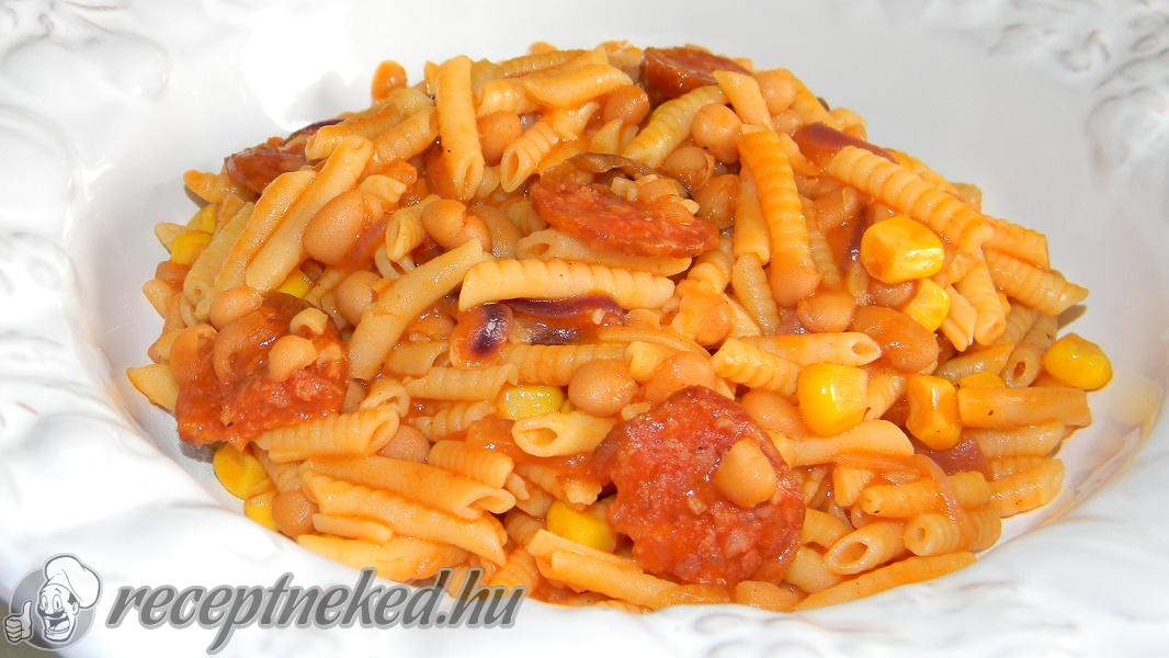 Hozzáadjuk a babkonzervet és a kukoricát, sózzuk, borsozzuk, megszórjuk egy leheletnyi őrölt köménnyel, és felöntjük egy kevés vízzel. Mikor a tészta megfő, (pár perc) a szaft is kellően besűrűsödik, ekkor lehúzzuk a tűzről, és már tálaljuk is.