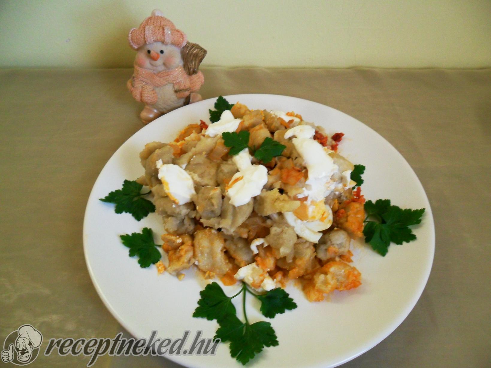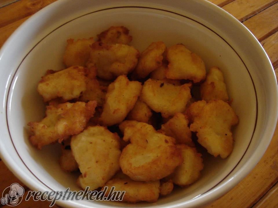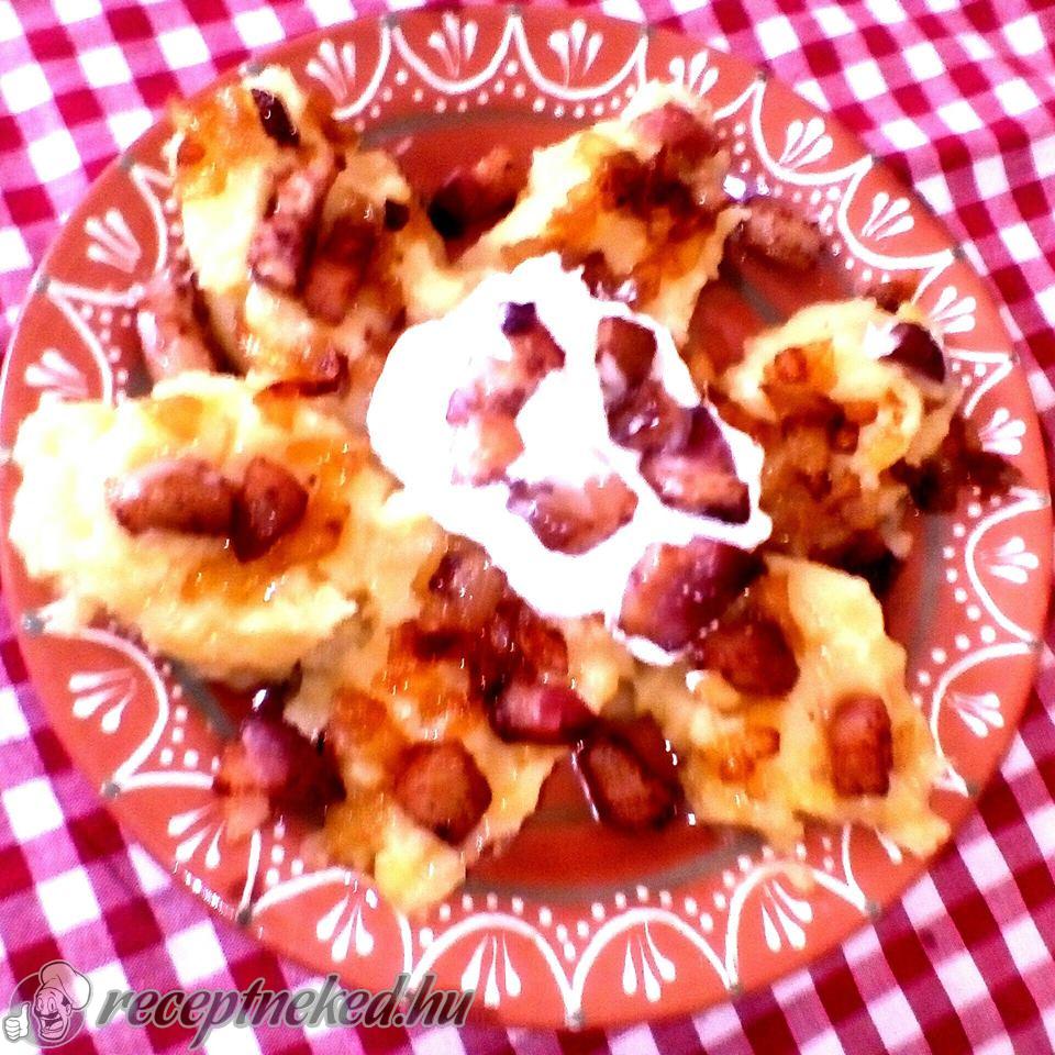 Amikor a burgonya megfőtt, annyi vizet hagyunk rajta, hogy ellepje, majd burgonya törővel áttörjük. Apránként adagoljuk hozzá a lisztet és folyamatosan keverjük. Amikor elválik az edény falától és nem is túl kemény, nem is lágy, akkor a tűzről levéve egy kizsírozott sütőlemezre vagy palacsinta sütőbe evőkanál segítségével a hagymába megforgatva beleszaggatjuk.