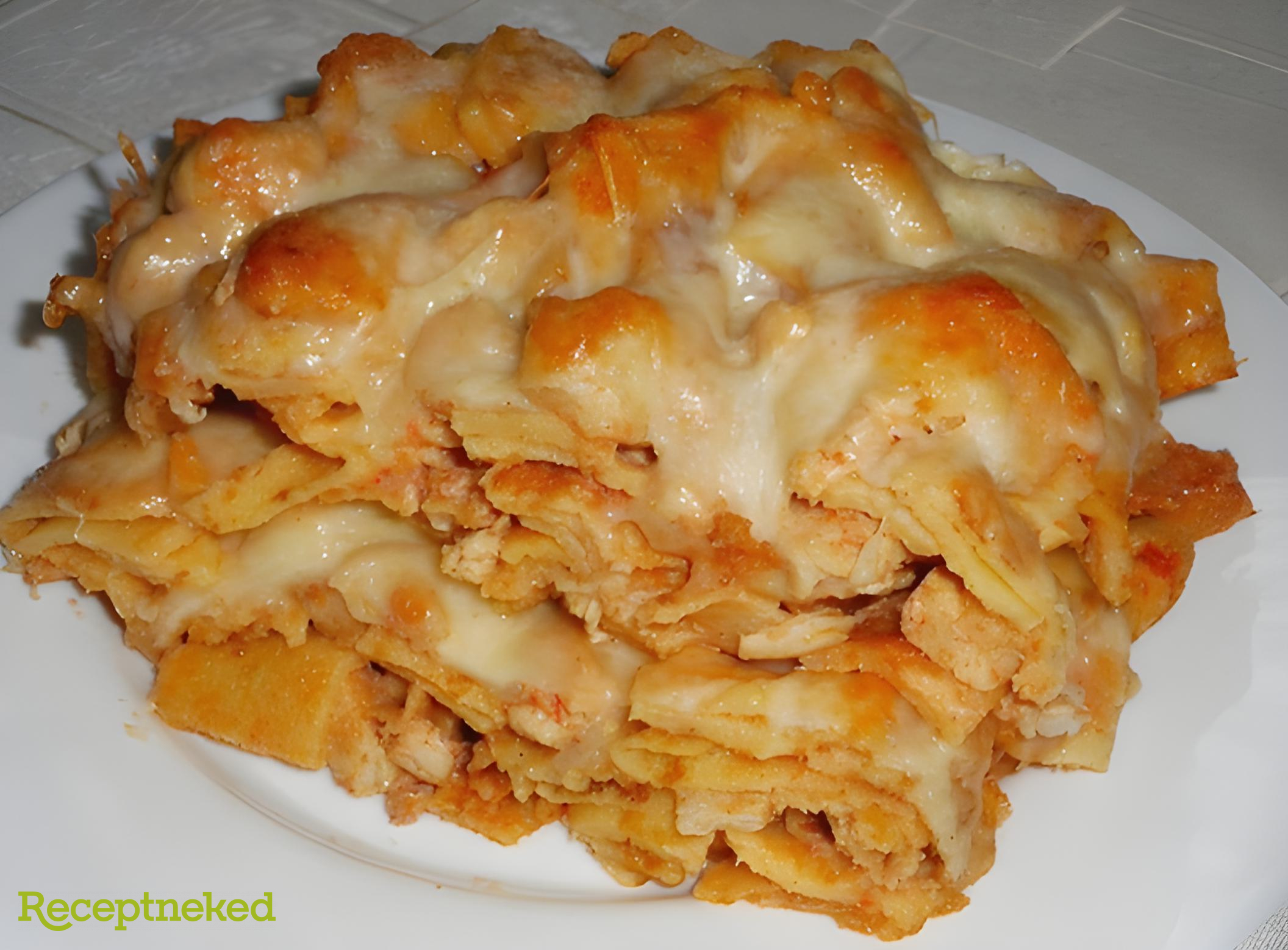 Egy hőálló tálat étolajjal vékonyan kikenünk, megszórjuk egy kevés zsemlemorzsával, és beleöntjük a tésztával összekevert csirkepaprikást.