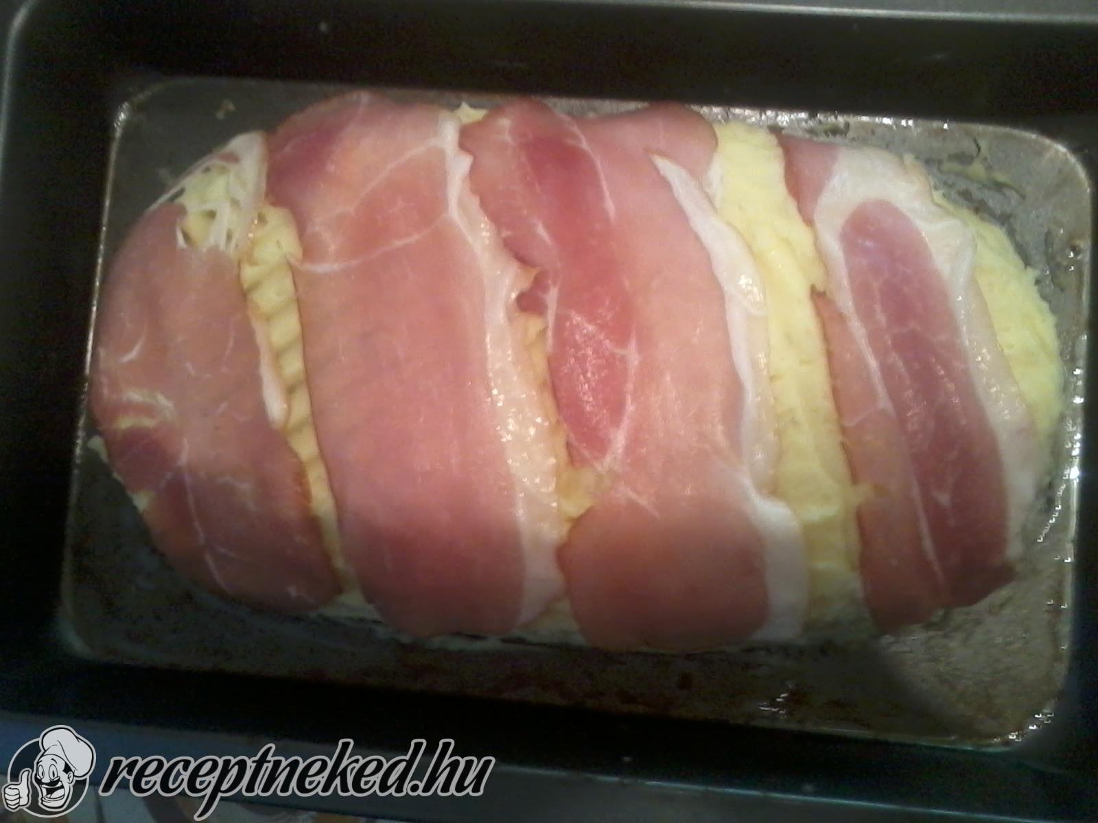 Kockára vágott krumplit megfőzök és krumplipürét készítek. A sütőből kivett és kihűlt fasírtot megkenem a krumplipürével és a tetejét baconnel borítom be és visszateszem a sütőbe, pirosra sütöm.