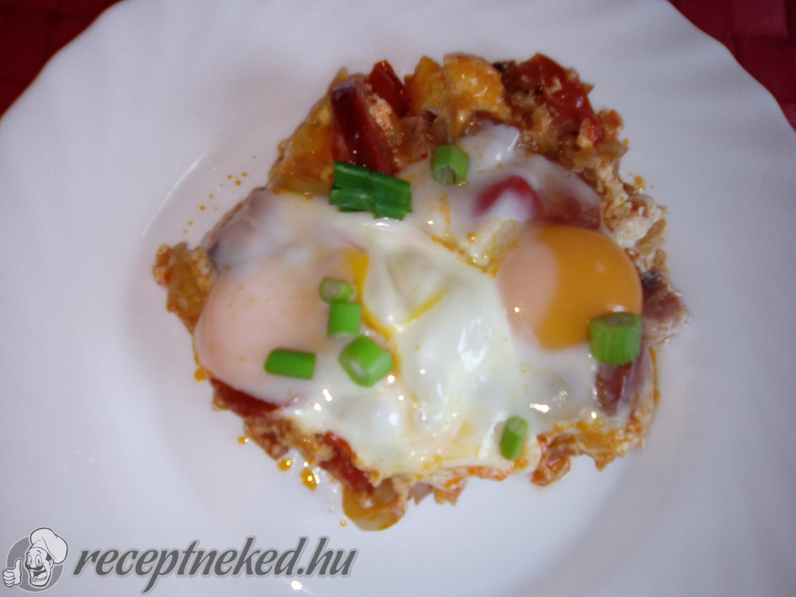 Pár percig együtt sütjük, majd a ragura ráütjük a tojásokat. Kb. 2 percig sütjük, majd a serpenyőt lehúzzuk a tűzről, hogy a fehérje teljesen megszilárduljon, de a sárgája még kissé folyós maradjon. Tálaláskor megszórjuk a felkarikázott újhagymával.