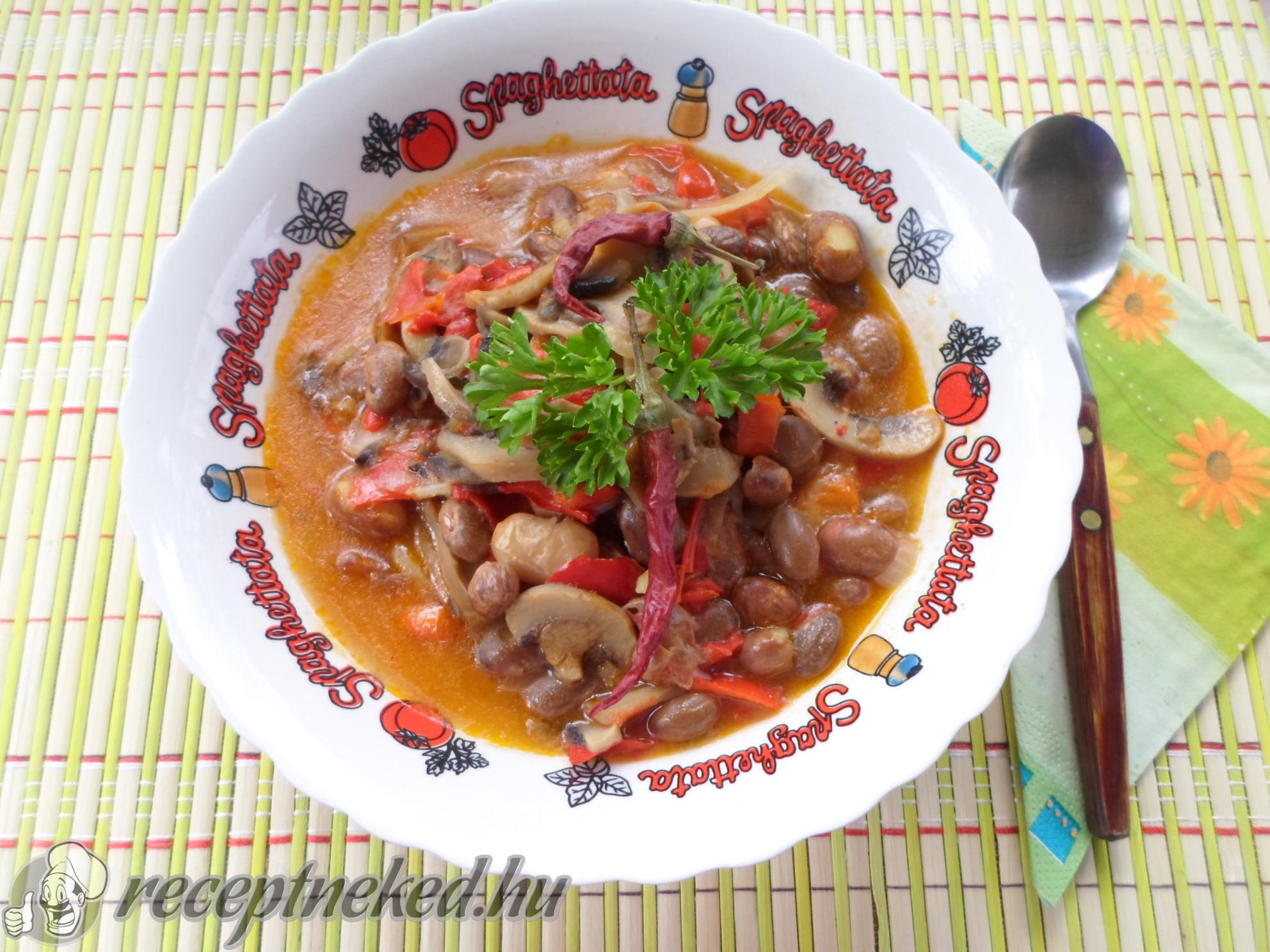 Hozzáadjuk a fejtett babot, és fedő alatt főzzük, majd beletesszük a cikkekre szeletelt paradicsomot, és készre főzzük.