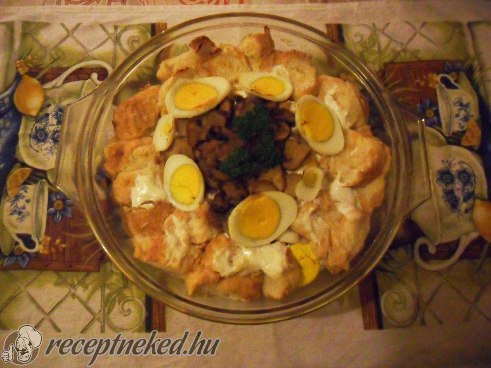 A tojásokat keményre főzzük, megtisztítjuk, majd karikákra szeleteljük. Egy margarinnal kikent tűzálló tálba rétegezve lerakjuk az áztatott kifliket, a gombás keveréket és a főtt tojáskarikákat. Minden réteget vékonyan megkenünk tejföllel. A rétegezést addig folytatjuk, amíg a hozzávalók elfogynak, és a tetejét kiflikarikákkal zárjuk le.