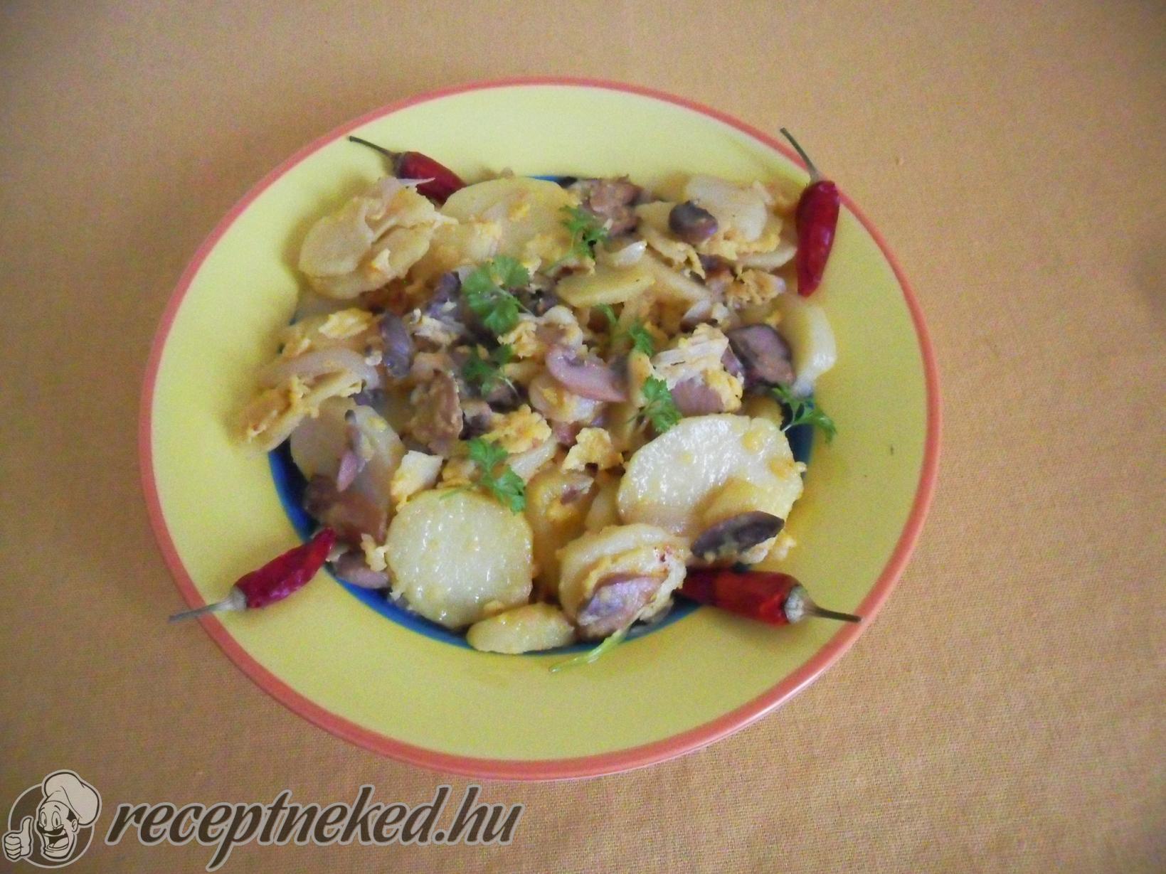 A meghámozott burgonyát vékony karikákra szeleteljük, majd egy serpenyőben forró olajon enyhén átsütjük. Közben a megtisztított vöröshagymát cikkekre vágjuk, és a megtisztított gombát is előkészítjük. A hagymát és a gombát a serpenyőben lévő burgonyához adjuk, és együtt sütjük tovább. Ízlés szerint sózzuk és borsozzuk.