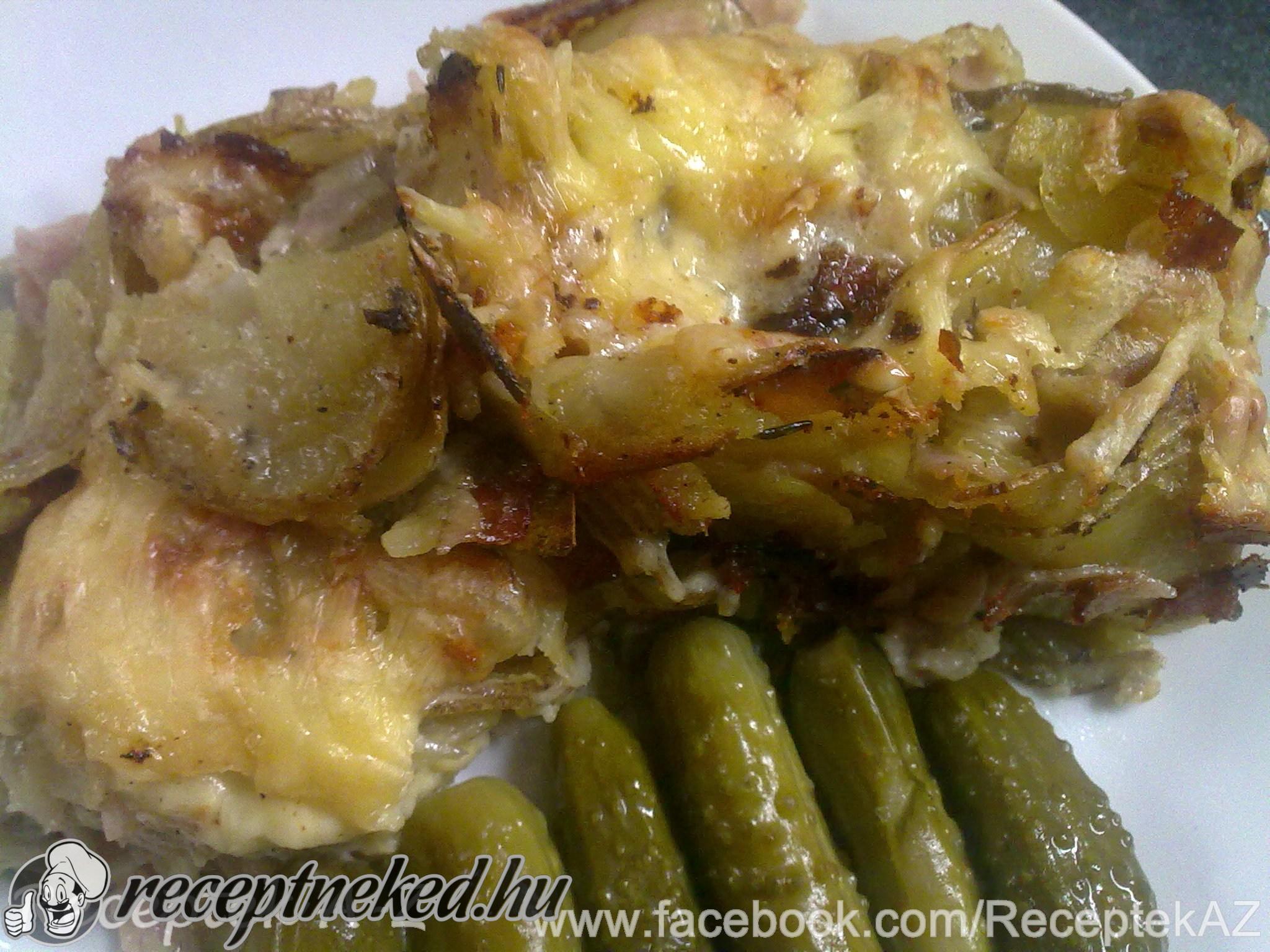 Tepsibe tesszük a burgonyát és a hagymát, megszórjuk sóval, borssal, pirospaprikával, petrezselyemmel és a majoránnával.