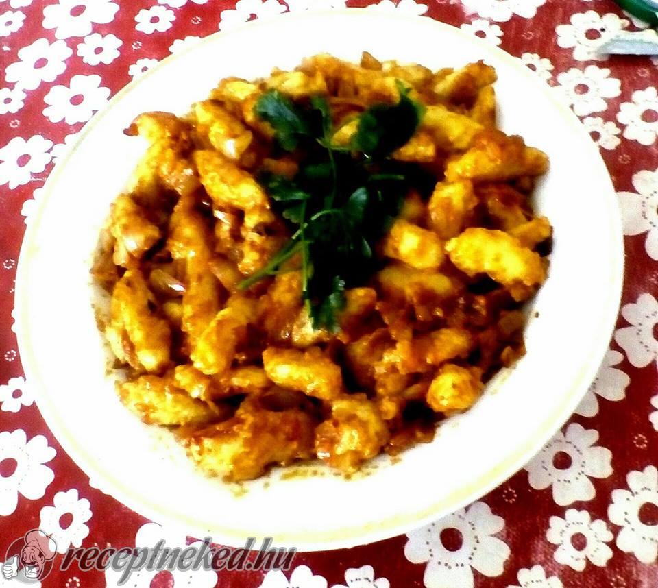 Közben a zsíron a finomra vágott hagymát megdinszteljük és rászórjuk az őrölt paprikát, majd a nudlikat óvatosan belekeverjük.