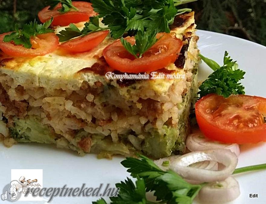 Egy közepes méretű hőálló tálat kikenünk vékonyan vajjal, majd az alján elosztjuk a lecsepegett brokkolit és meghintjük egy kevés sóval. Ha puha a hús és elfőtte a levét akkor összekeverjük a rizzsel és egyenletesen elsimítjuk a brokkoli tetején.