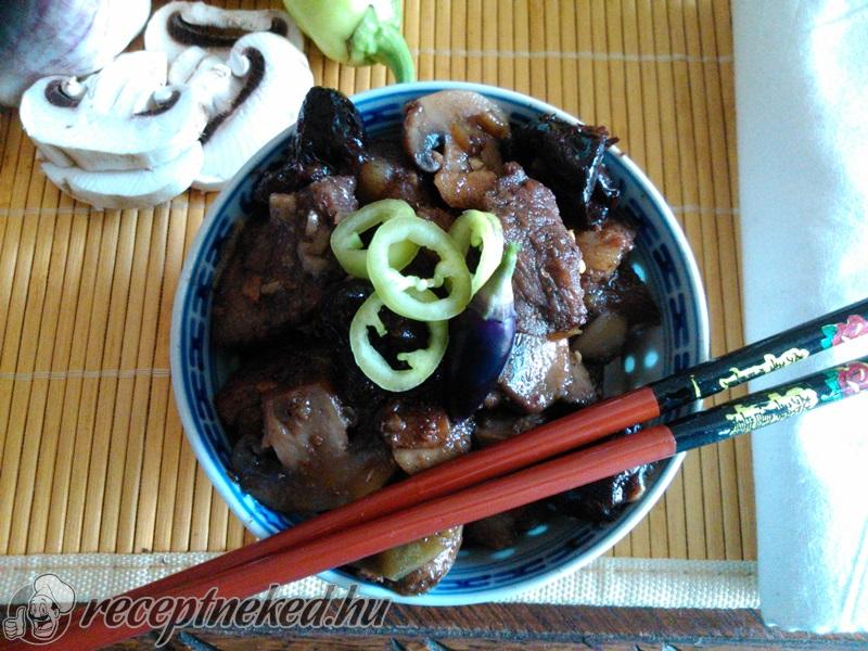 [box style=”info”]A chili paprikánál aki nem szereti a nagyon erőset, vegye ki a magját. Só nem kell bele, mert a szójaszós elég sós, azzal lehet ízesíteni. A szójaszószból és a rizsecetből is lehet többet vagy kevesebbet beletenni. Nekem kb ez az arány jött be. Nagyon kellemes, édeskés, csípős, pikáns kínai étel.[/box]