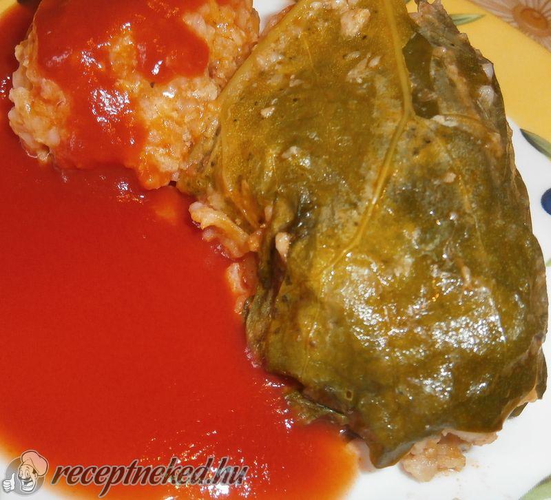 A készre főtt karalábélevélbe töltött húsgombócokat kiszedjük egy tányérra és mellé szedjük a paradicsomszószt.
