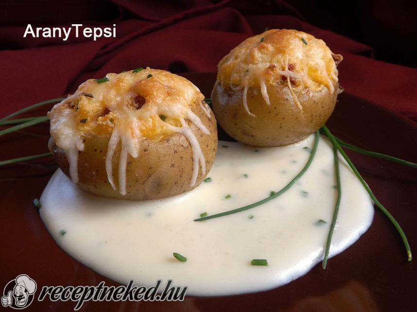 A szószt tányérra kanalazzuk és a töltött krumplikat ráültetve, azonnal tálaljuk.