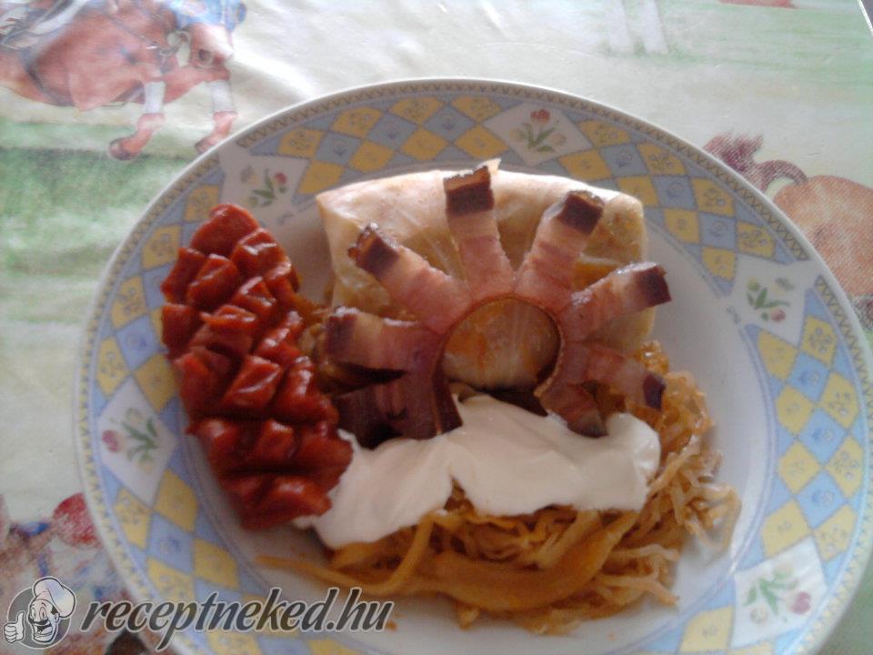 Amikor a káposzta megpuhult, óvatosan kiszedjük a fazékból. A maradék levet paprikás rántással besűrítjük. Végül a kolbászt is kisütjük a szalonna zsírján, és tálalás előtt a töltött káposzták tetejére tesszük.