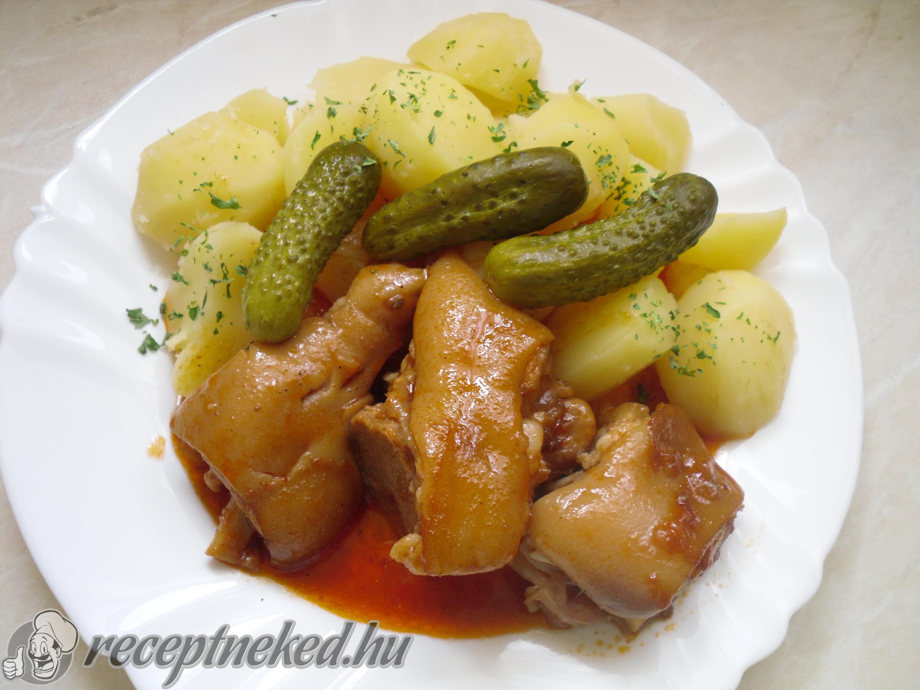 Sós vízben főtt burgonyával és savanyúsággal tálaljuk.