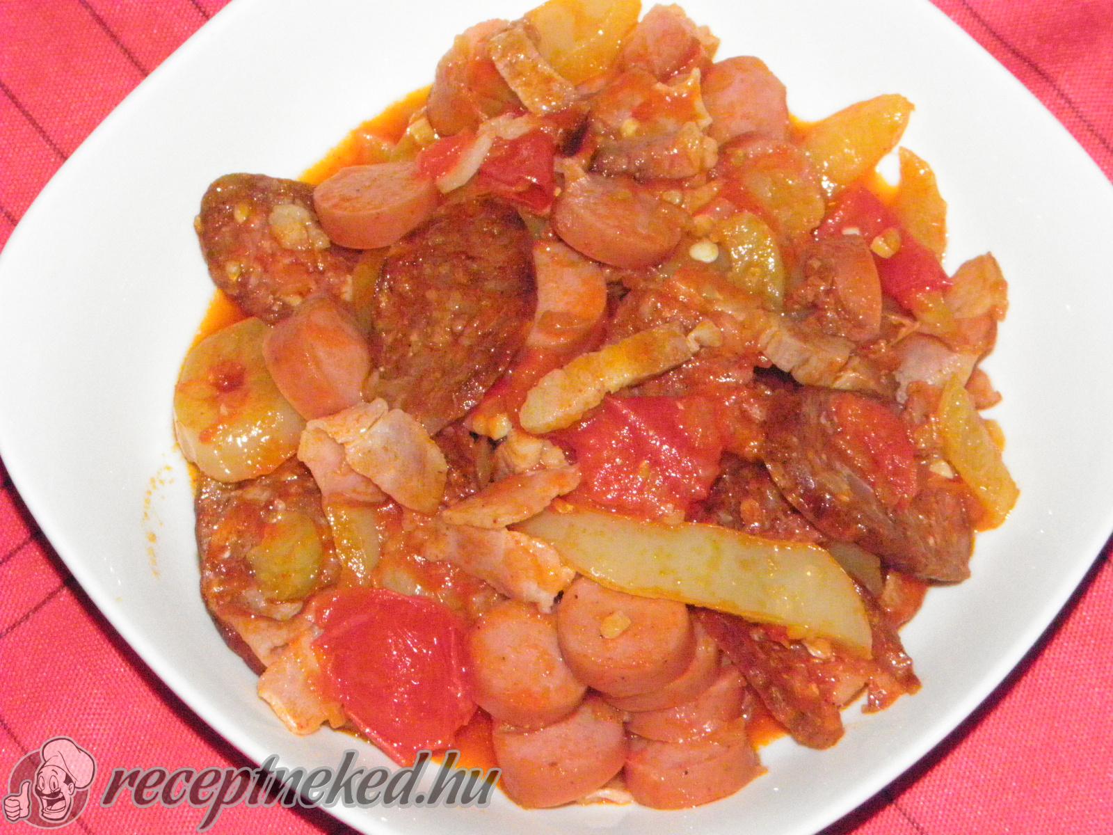 Megszórom pirospaprikával, hozzáadom a feldarabolt paradicsomot, ízesítem cukorral, beleteszem a karikára vágott virslit és kolbászt, fedő alatt 10 percig főzöm, majd tálalom.