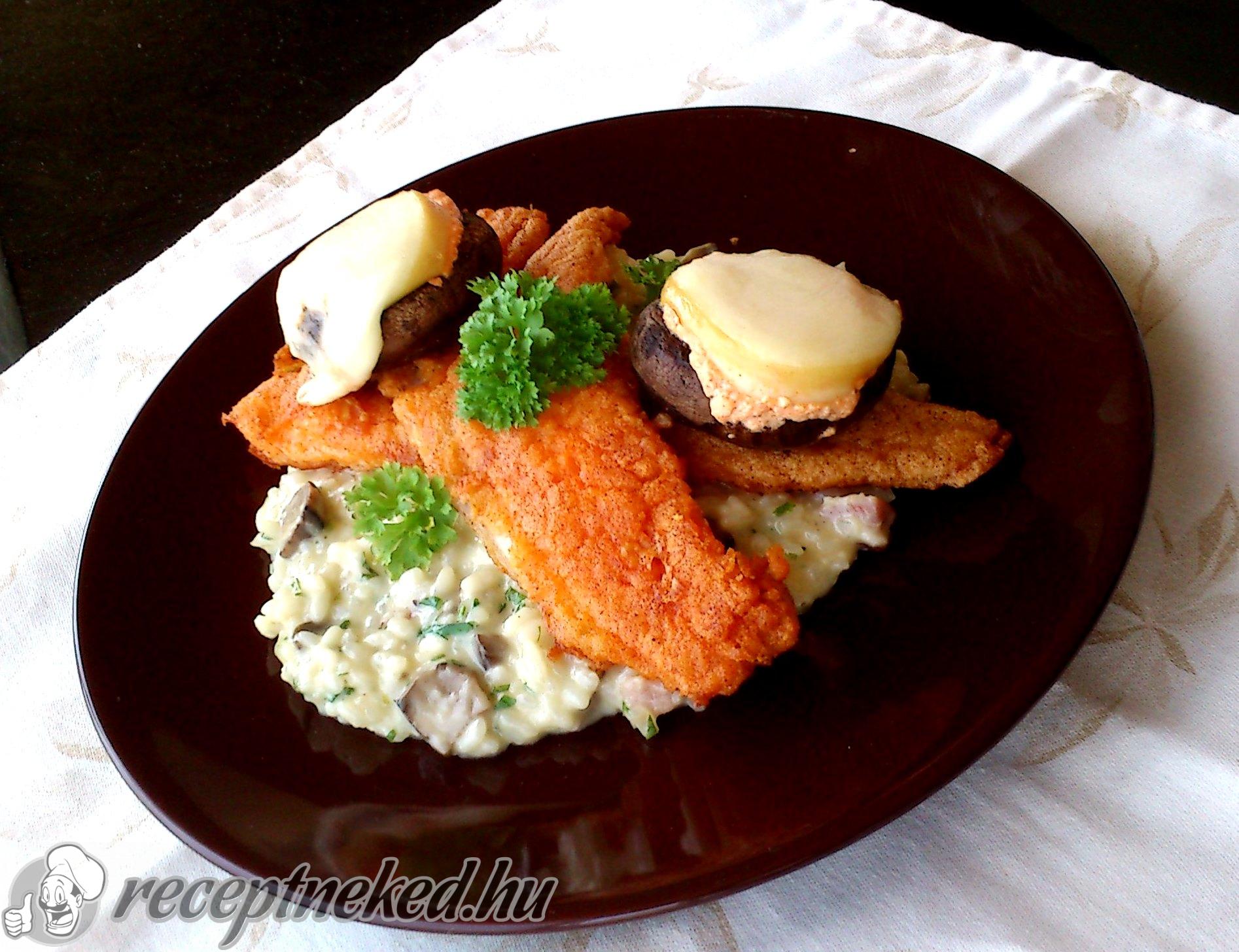 Tálaláskor pár kanál rizottót a tányér közepére teszünk, rá két darab halfilé kerül, az egész tetejére pedig két gombát ültetünk.