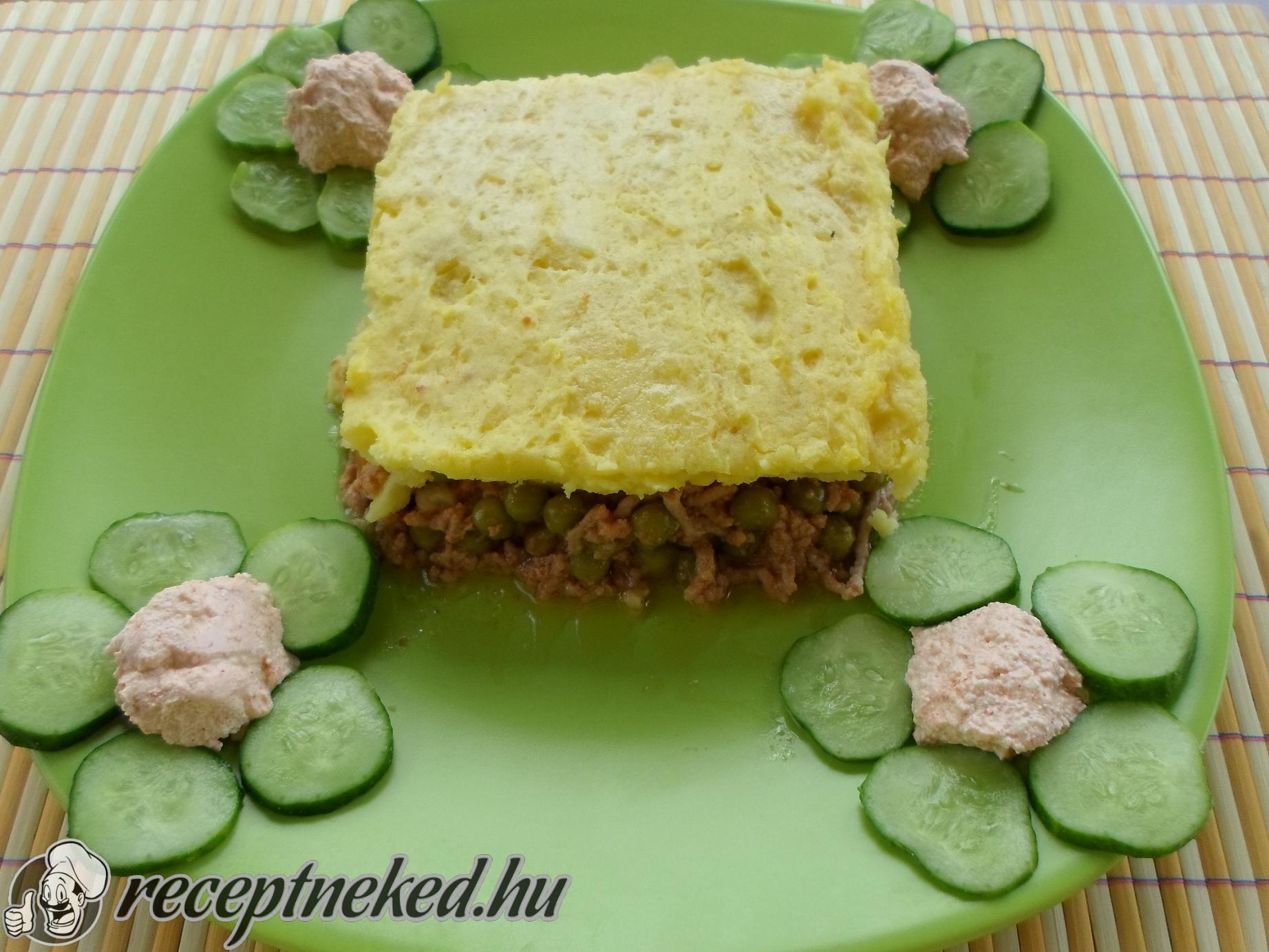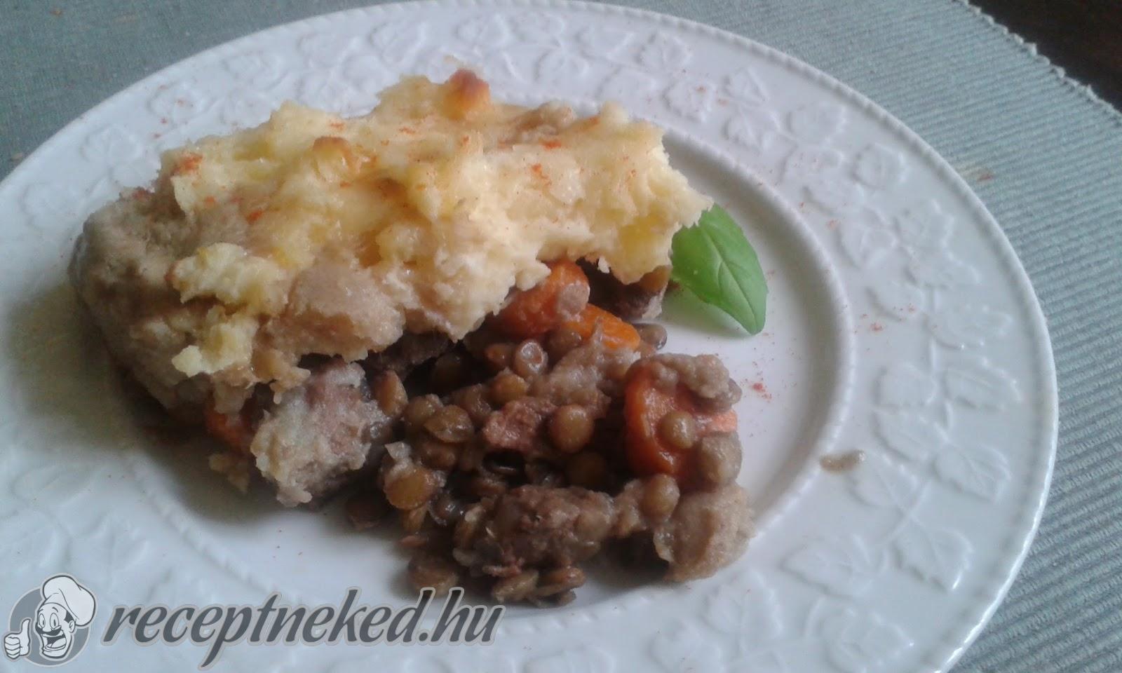 Egy pitetál aljára öntjük a húsos ragut, amit befedünk a burgonyapürével, végül a tetejét először megszórjuk zsemlemorzsával és reszelt sajttal.