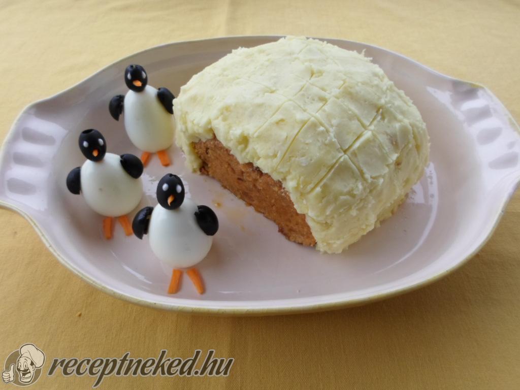 A pingvinekhez a tojásokat megfőzzük, megpucoljuk. Egész olajbogyó a pingvin feje, fél-fél bogyó a szárnya, valamint sárgarépa cikkek a talpuk és a csőrük.