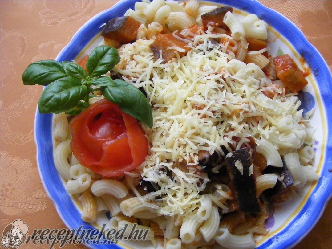 A kivajazott tepsibe tesszük a megfőtt tészta felét, rátesszük a húsdarabokat, a padlizsánt, majd rátesszük a tészta másik felét és megszórjuk gazdagon reszelt sajttal.