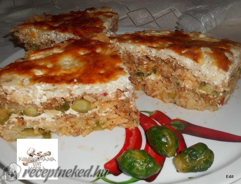 Arra figyeljünk, hogy a tetejére rizs kerüljön, majd végül tejföllel vastagon lekenjük, reszelt sajttal megszórjuk.