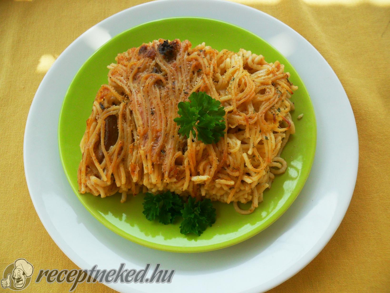 A tepsi alját kiolajozzuk, majd egyenletesen eloszlatjuk benne a májas spagettit.