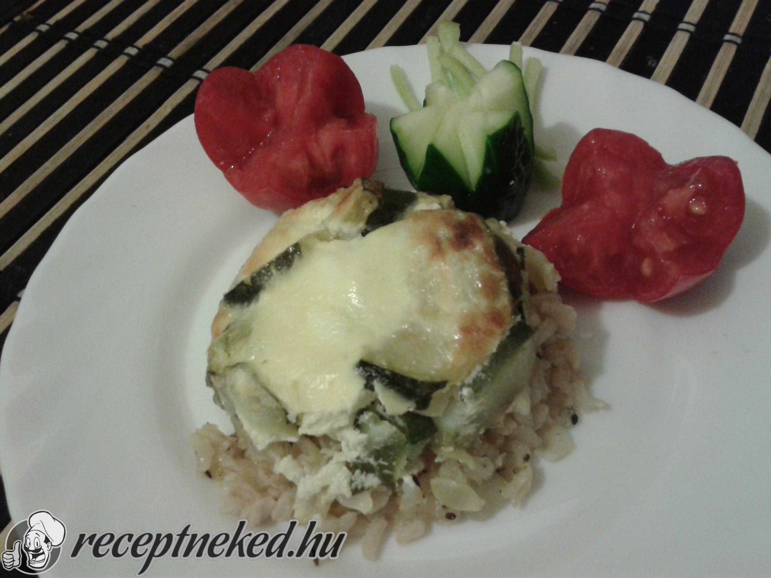 A cukkini karikát egy 20*30 cm-es tepsibe fektetjük szépen sorban, erre ráöntjük a darált hús és a rizs keverékét, majd a tetejét cukkini karikákkal fedjük be.