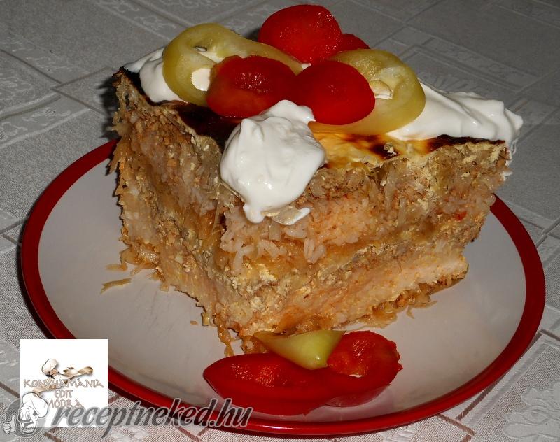 Egy hőálló tálat kenjünk ki étolajjal és szórjuk meg zsemlemorzsával. A káposzta 1/3 részét helyezzük a tál aljára. Locsoljuk meg a tejfölös keverék 1/3-ával. Helyezzük rá a főtt rizst felét, majd a darált húsos szaftos pörköltnek szintén a felét. Fedjük be újabb 1/3 rész káposztával, locsoljunk rá tejfölös keveréket, majd osszuk el rajta a maradék rizst és a maradék pörköltet. Fedjük be a maradék káposztával, majd locsoljuk meg a megmaradt tejföllel a tetejét.