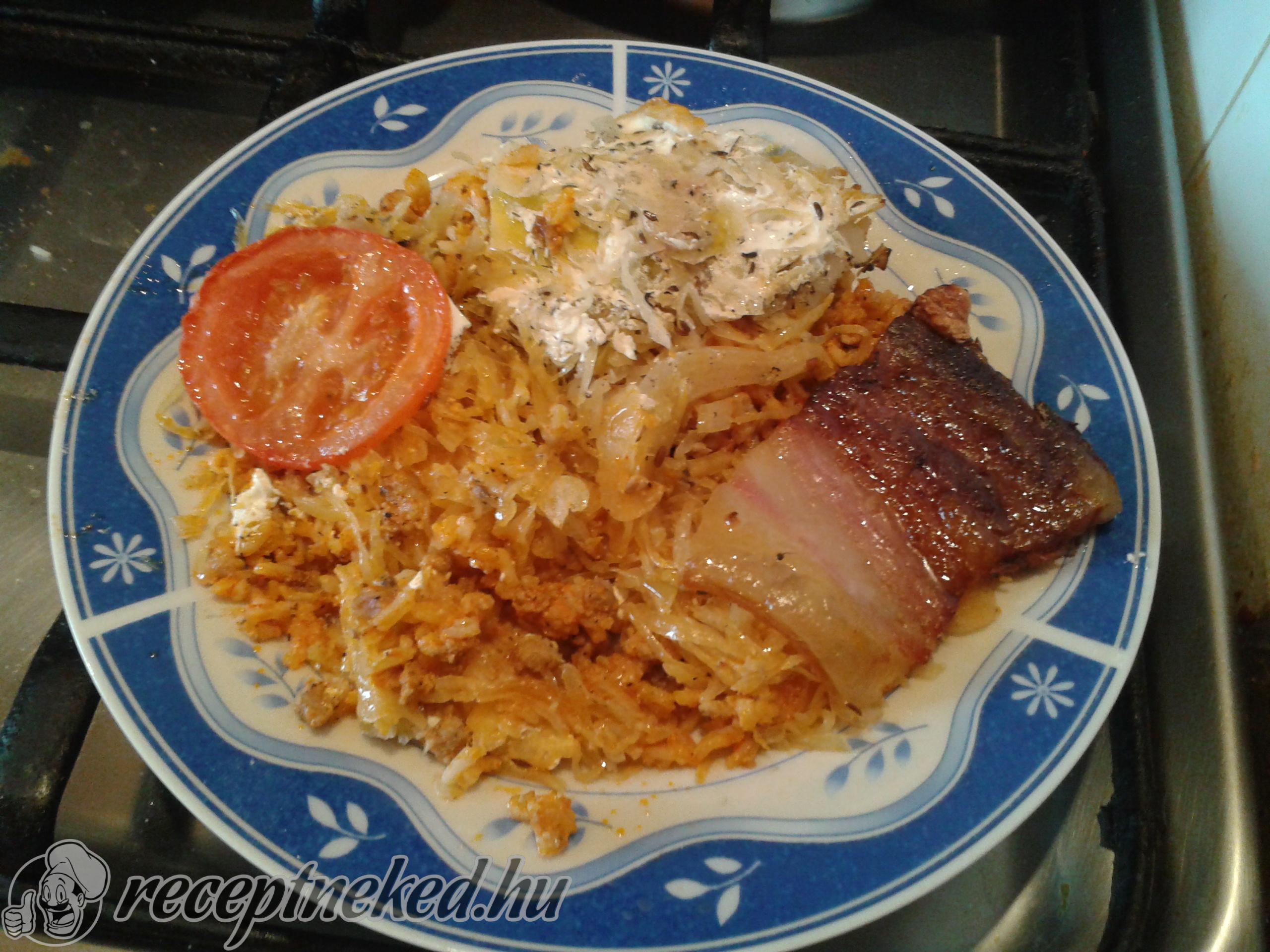 Egy jénai tálat kizsírozunk, és a savanyú káposzta felét lerakjuk, majd ráhalmozzuk a bekevert darált húst, és elsimítjuk. Beborítjuk a maradék savanyú káposztával, rászórjuk a fűszereket, borsot, köménymagot, csombort, kakukkfüvet, babérlevelet.