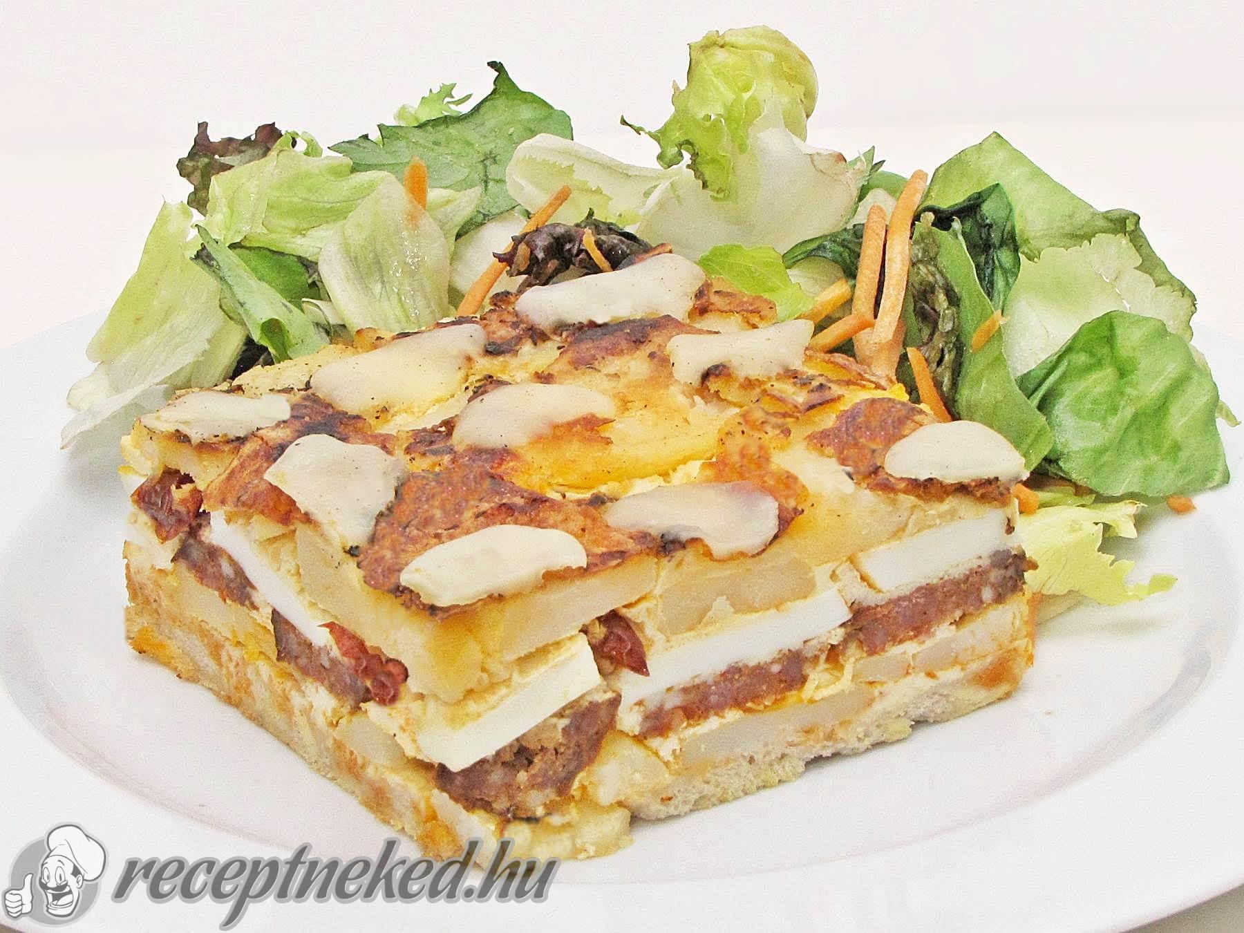 [box style=”info”]Az étel egy 2 személyes püspökkenyér formában készült. Nagyobb mennyiségben tepsiben is elkészíthető, a mennyiségek növelésével.[/box]