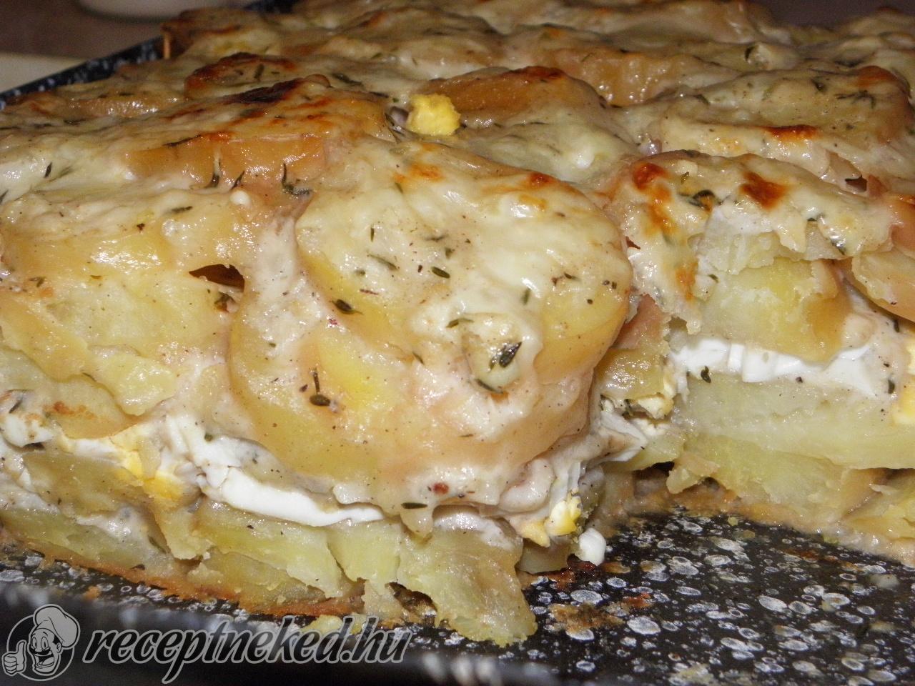 Egy tepsit kikenünk vajjal, és megszórjuk zsemlemorzsával, majd a krumpli felét belekarikázzuk, elrendezzük az alján, sózzuk, és őrlünk rá kevés borsot.