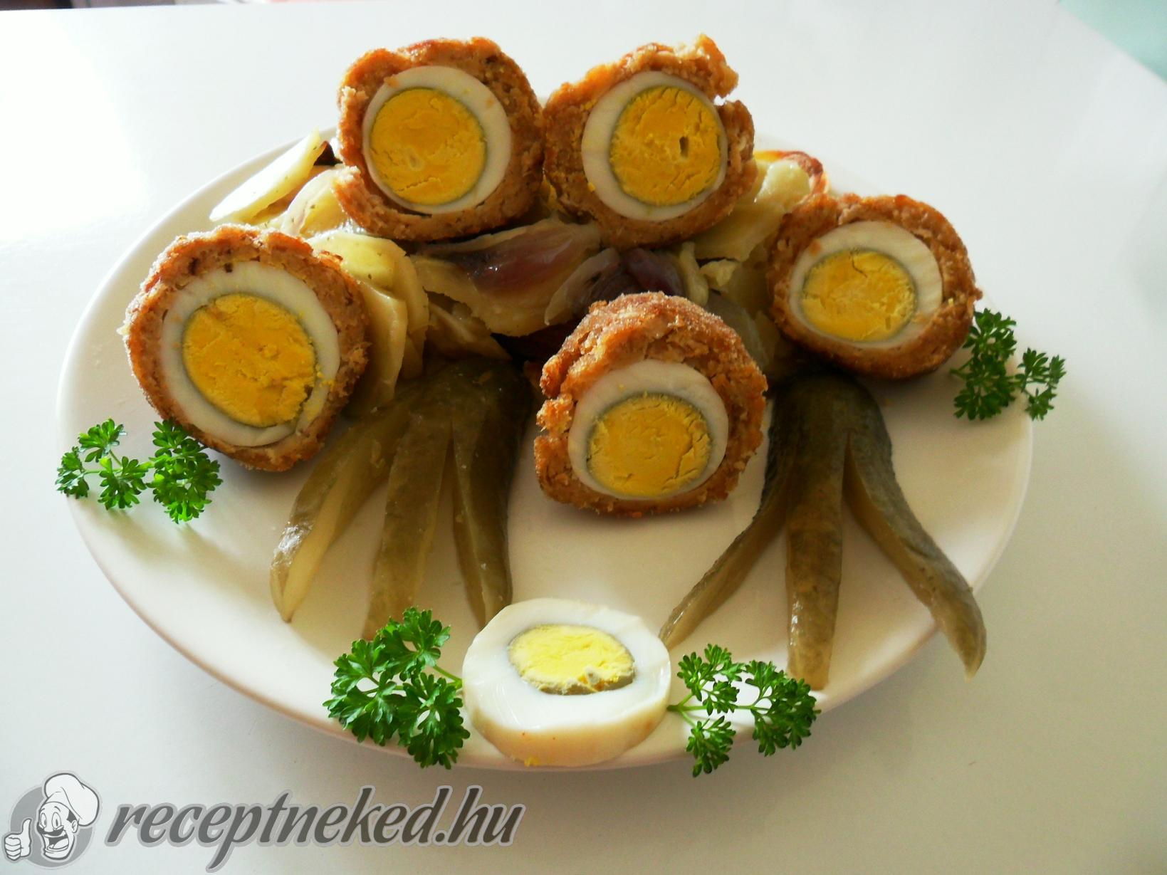 Közben a megfőtt tojásokat megpucoljuk, és egyenként a fasírtmasszába csomagoljuk. Zsemlemorzsába forgatjuk, majd bő, forró olajban aranybarnára sütjük. A kisült skót tojásokat félbevágjuk, és a megsült burgonya tetején tálaljuk.