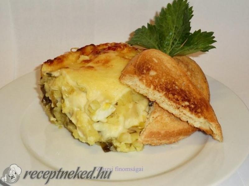Tehát újból burgonya, majd a hagyma, a tojás és végül a sajtmártás. A reszelt sajttal megszórjuk, rátesszük a jénai tetejét vagy alufóliával lefedjük és 200 fokra előmelegített sütőben 40-45 percig sütjük. Ha nem melegítjük elő a sütőt, kicsit tovább.