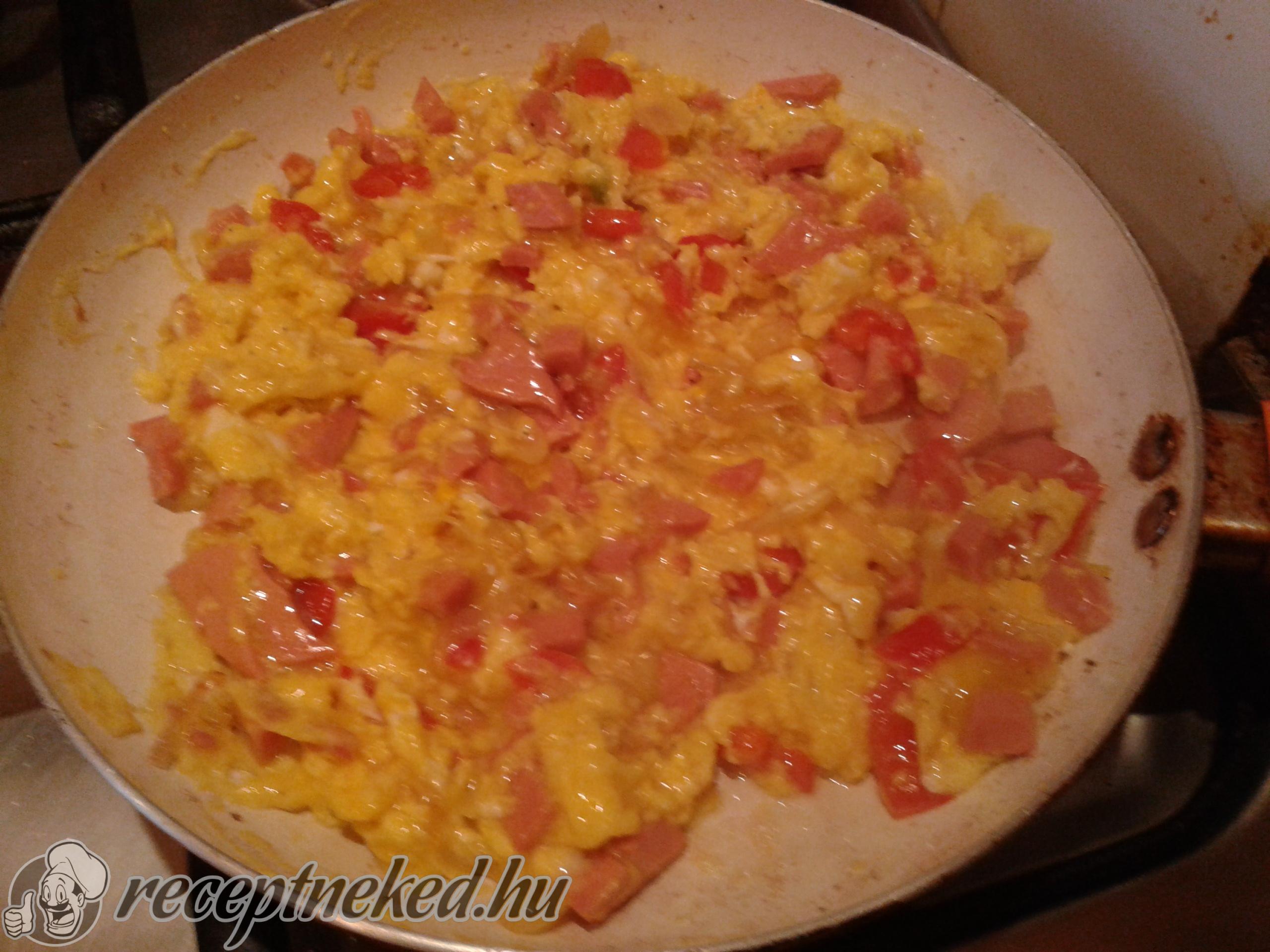 A tojásokat sóval felverjük és ráöntjük a sült alapra, majd ízlés szerinti állagúra sütjük.