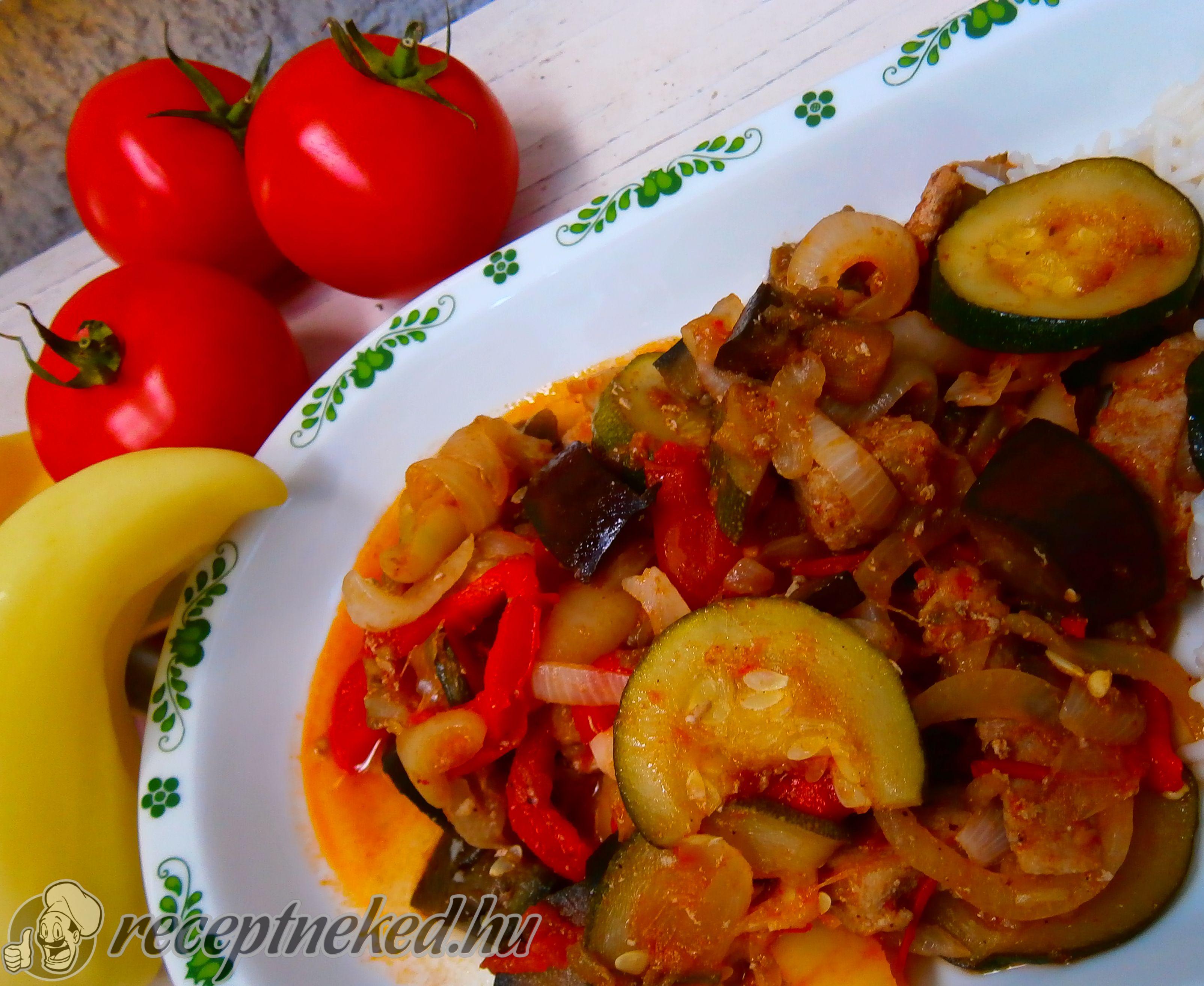 Mossuk meg a zöldségeket, a padlizsánt kockázzuk fel, a paprikákat vékony karikákra vágjuk, a paradicsomot gerezdekre, a cukkinit karikára (de lehet kockára is).