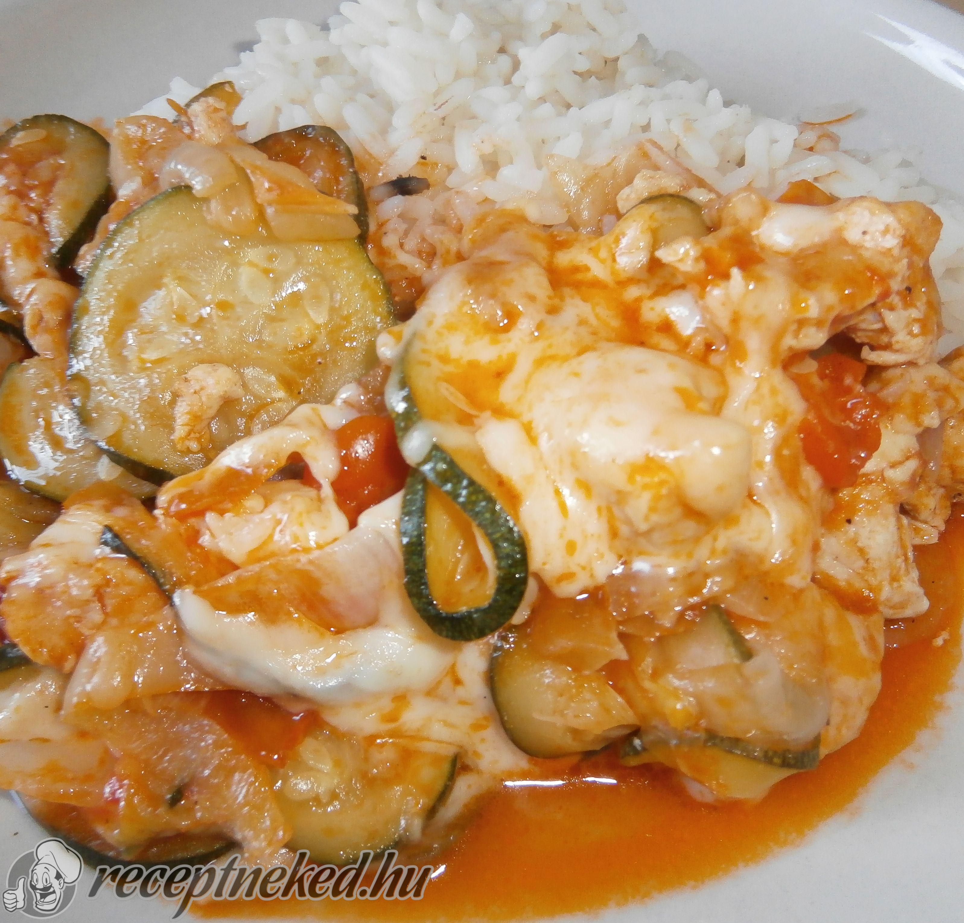 Egy közepes tepsit olajjal kikenjük, a zöldségeket elterítjük az alján, rátesszük a pörköltet, meglocsoljuk a tejfölös öntettel, megszórjuk reszelt sajttal és előmelegített, 200 fokos sütőben szép pirosra sütjük.
