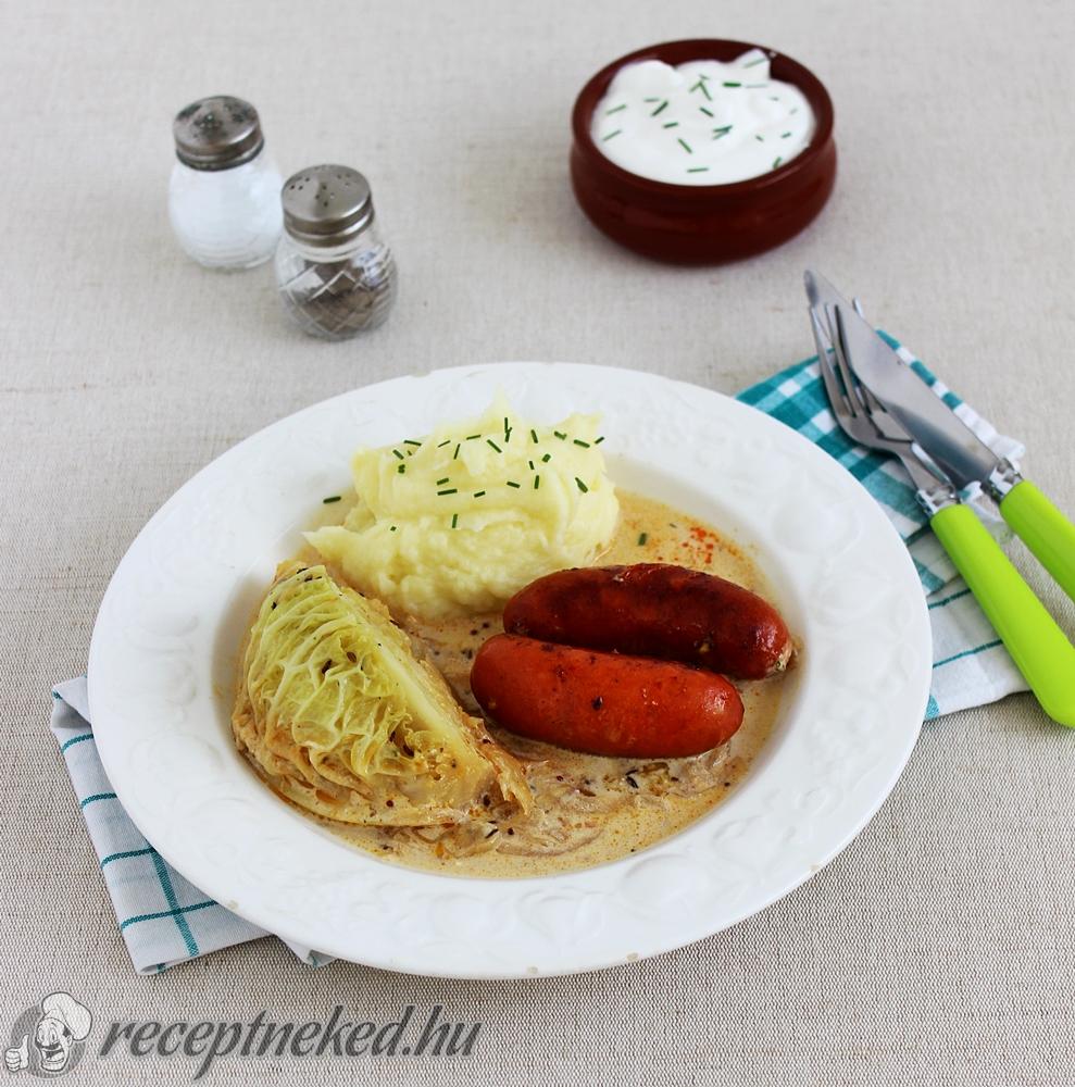 Tálaláskor kanalazzunk a tányérba pár kanál hagymás szaftot, helyezzük rá a káposztát, a kolbászt, a köretet, majd úgy kínáljuk.