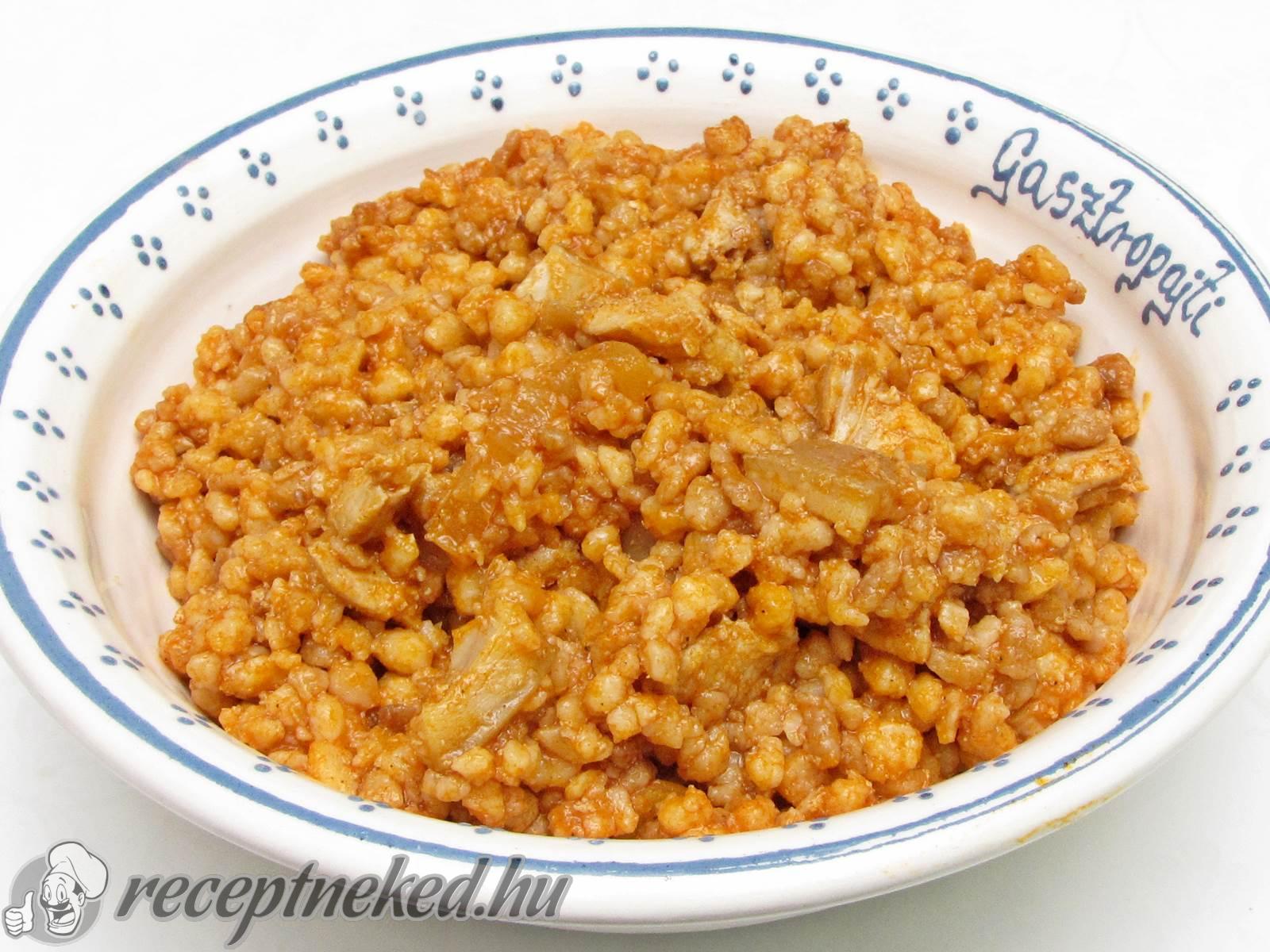 Az apróra vágott paradicsom is hozzákerül, majd kicsivel később a paprikaszeletek is, valamint az őrölt paprika, a fokhagyma, és a bors is. A szalonnát végig benne hagyhatjuk, mert kitűnő ízt ad a tarhonyás húsnak, ugyanúgy, mint a kissé kövérkés hús is, ami szaftosabbá teszi az ételt.
