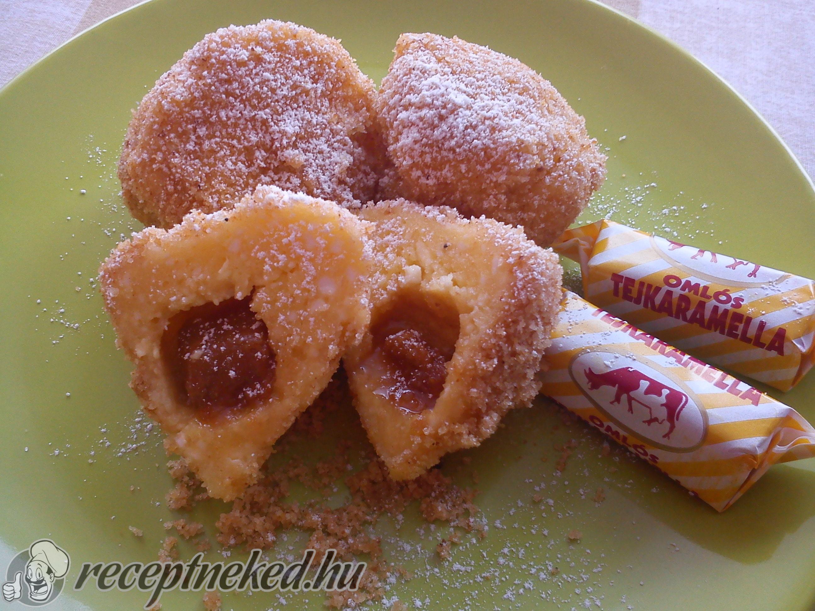 A tojásokat kettéválasztjuk, majd a sárgáját elkeverjük a túróval, a vaníliacukorral, a porcukorral és a búzadarával. A tojások fehérjét kemény habbá verjük, majd az előbbi masszához keverjük. A masszából vizes kézzel gombócokat formálunk és a félbe vágott tejkaramellákból egy-egy felet a gombócok közepébe helyezünk.