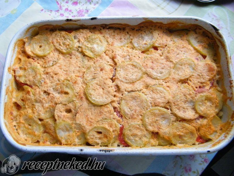 5 dl forró vízben feloldjuk a húsleveskockákat vagy ételízesítőt, majd a keveréket a tepsiben lévő rétegekre öntjük. A tejfölben elkeverjük a zúzott fokhagymát és a megmaradt paprikás-borsos-sós lisztet, majd egyenletesen a cukkini tetejére kenjük.