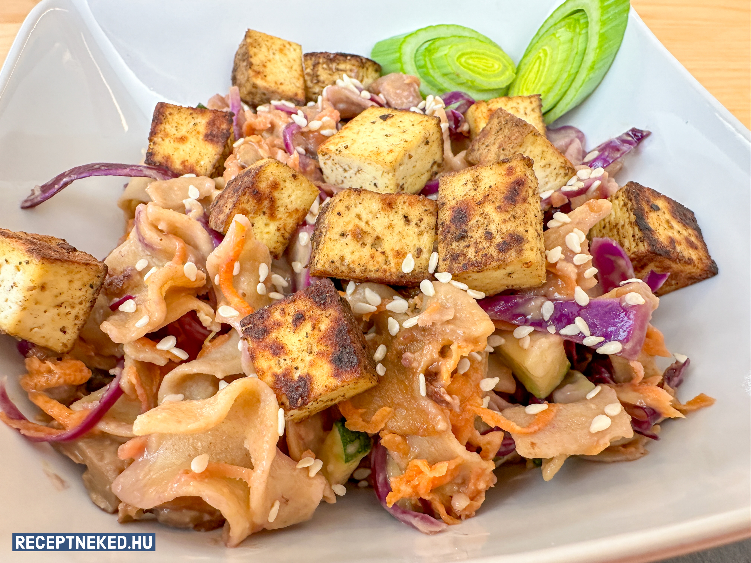 Az elkészült tésztás egytálételt a felkockázott és megsütött tofuval és pirított szezámmaggal tálaljuk.