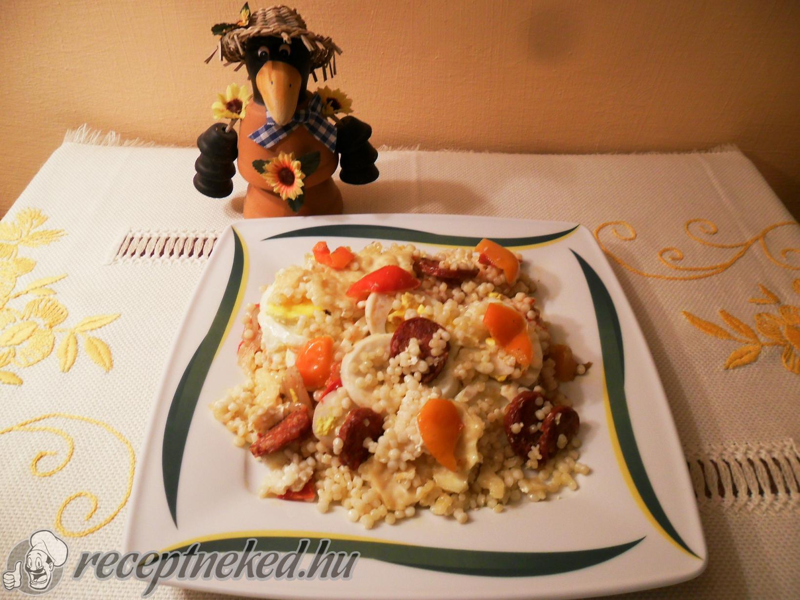 A tojásos lecsós tarhonya egy tartalmas, magyaros ízvilágú egytálétel. A pirított tarhonya, a lecsós alap, a kolbász és a tojás együtt gazdag, házias fogást ad, amelyet a sajtos-mustáros tejföl tesz még ízletesebbé.