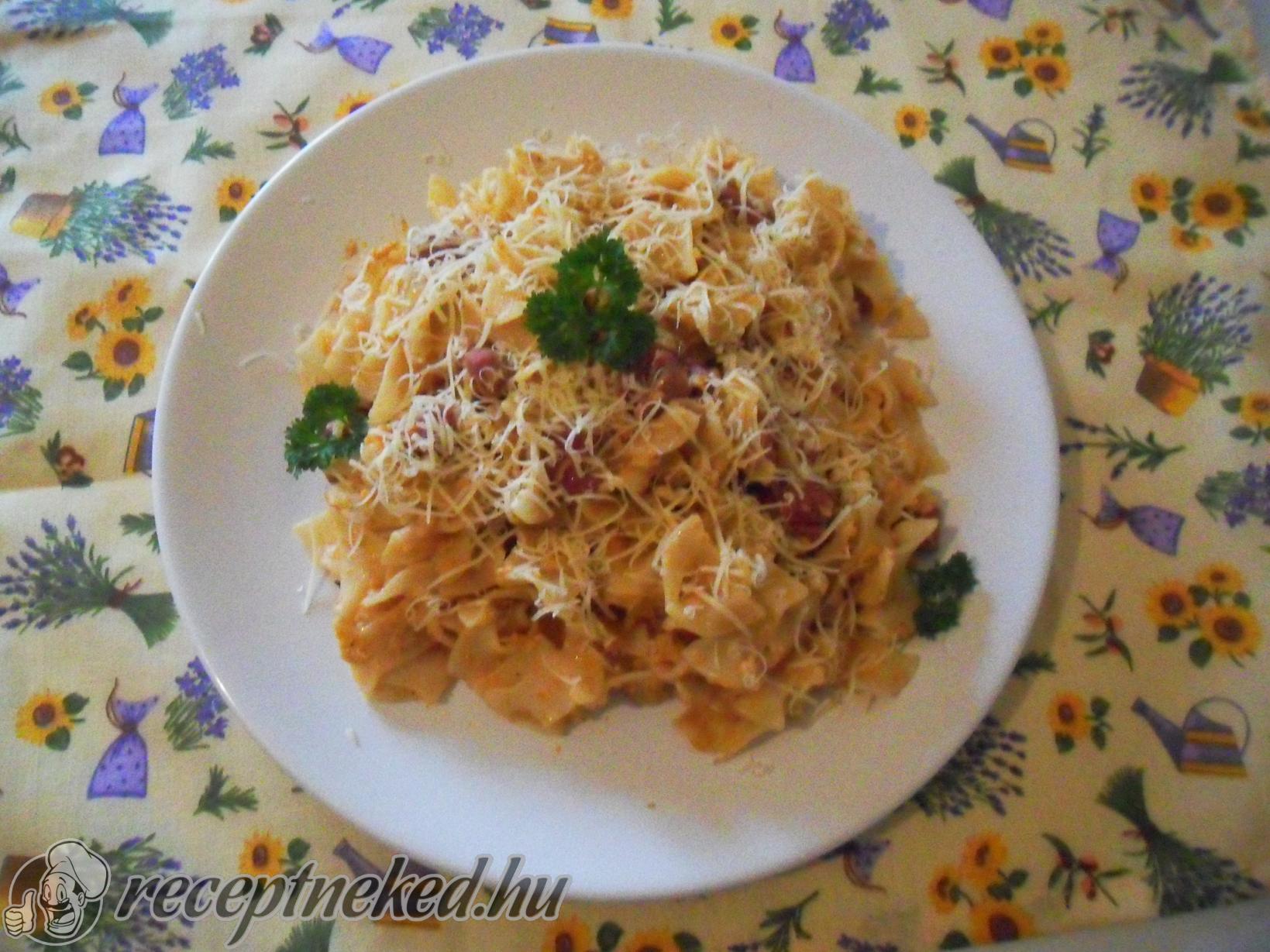 Ezután hozzáadjuk a leszűrt tésztát, és 2-3 perc alatt az egészet átpirítjuk.