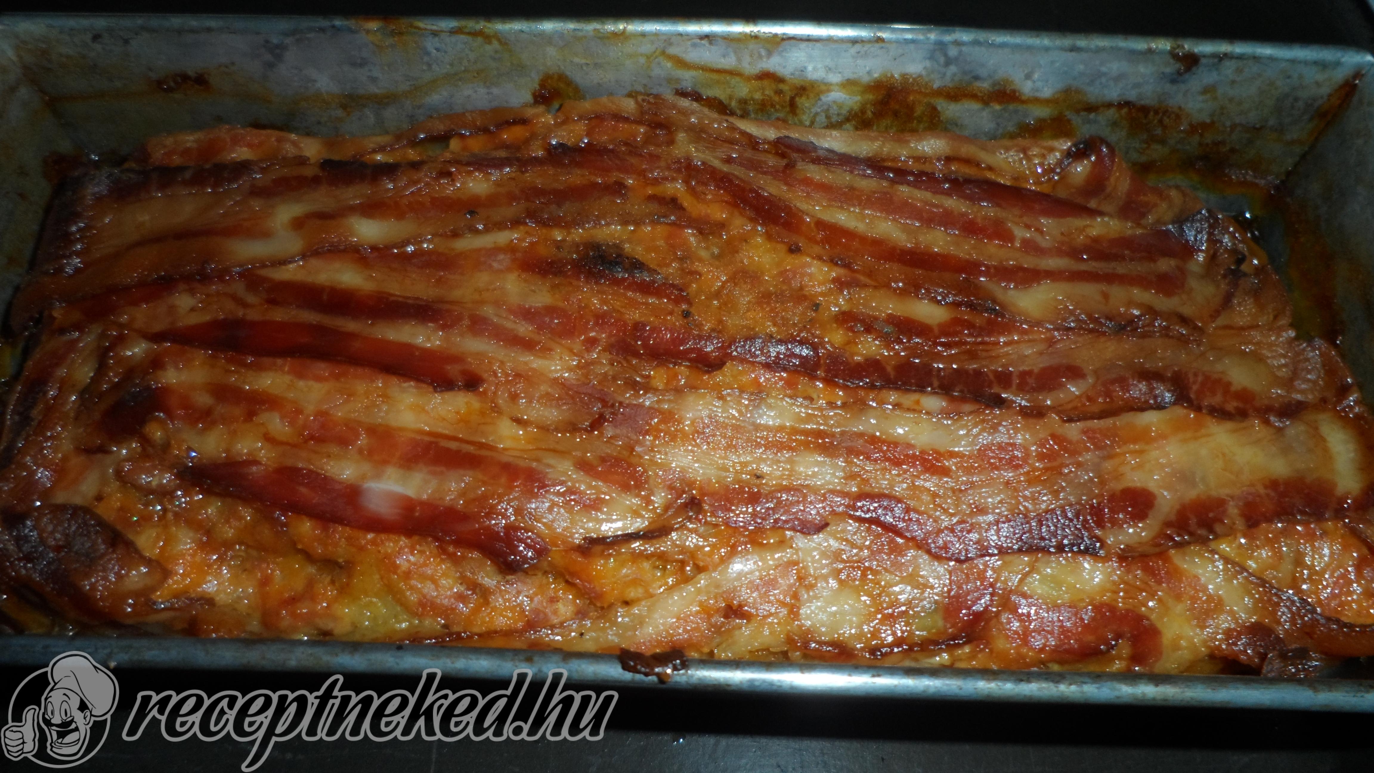 A húst a többi hozzávalóval jól eldolgozzuk. Két részre osztjuk. Az egyik felét egy sütőpapírra vagy zacskóra kiterítjük (előtte pici vízzel bekenjük a zacskót, hogy könnyebb legyen vékonyra szétnyomkodni rajta a húst).